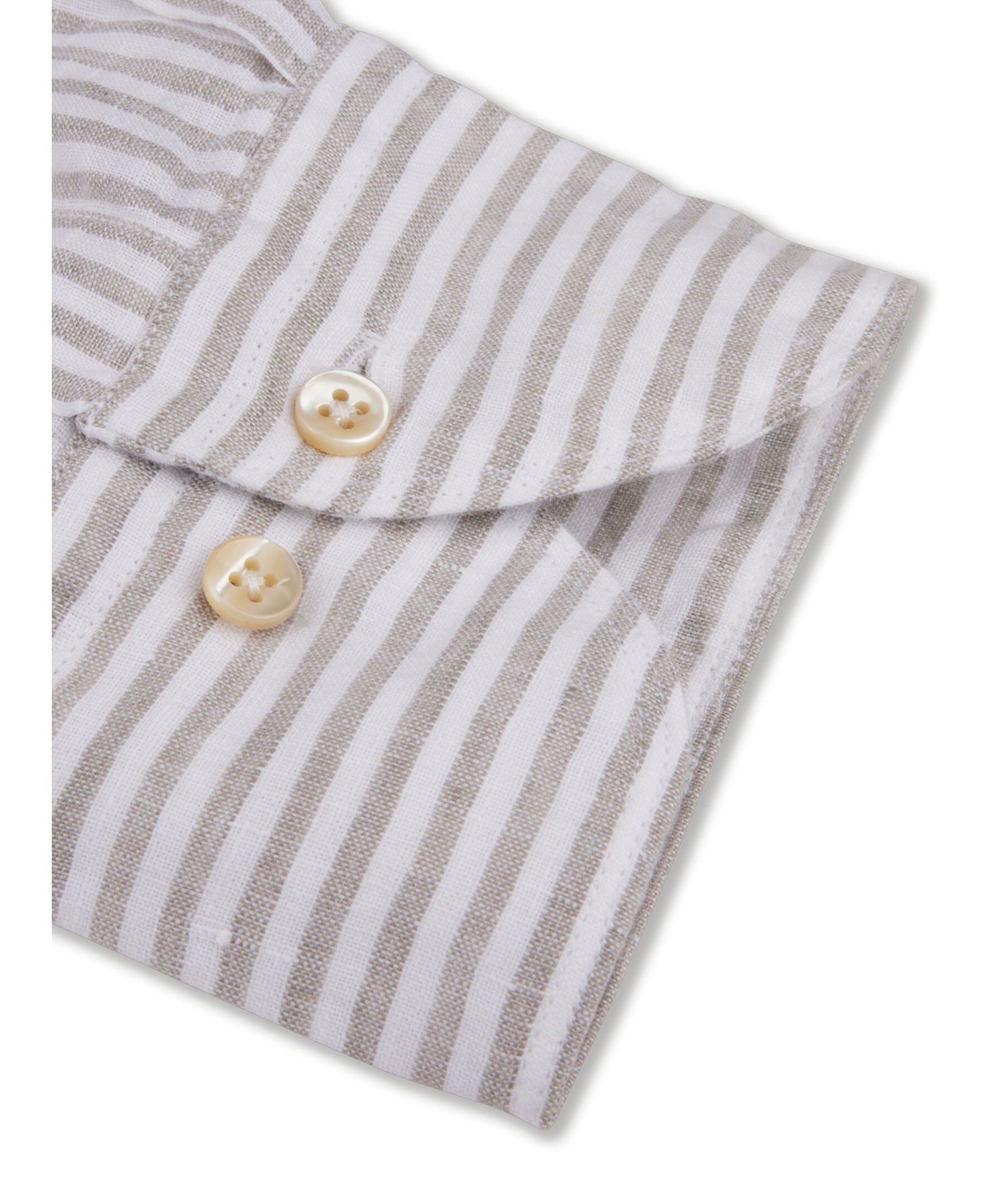 Denna randiga skjorta är tillverkad av linne och har pärlemorknappar, enkla manschetter och en cut away krage.