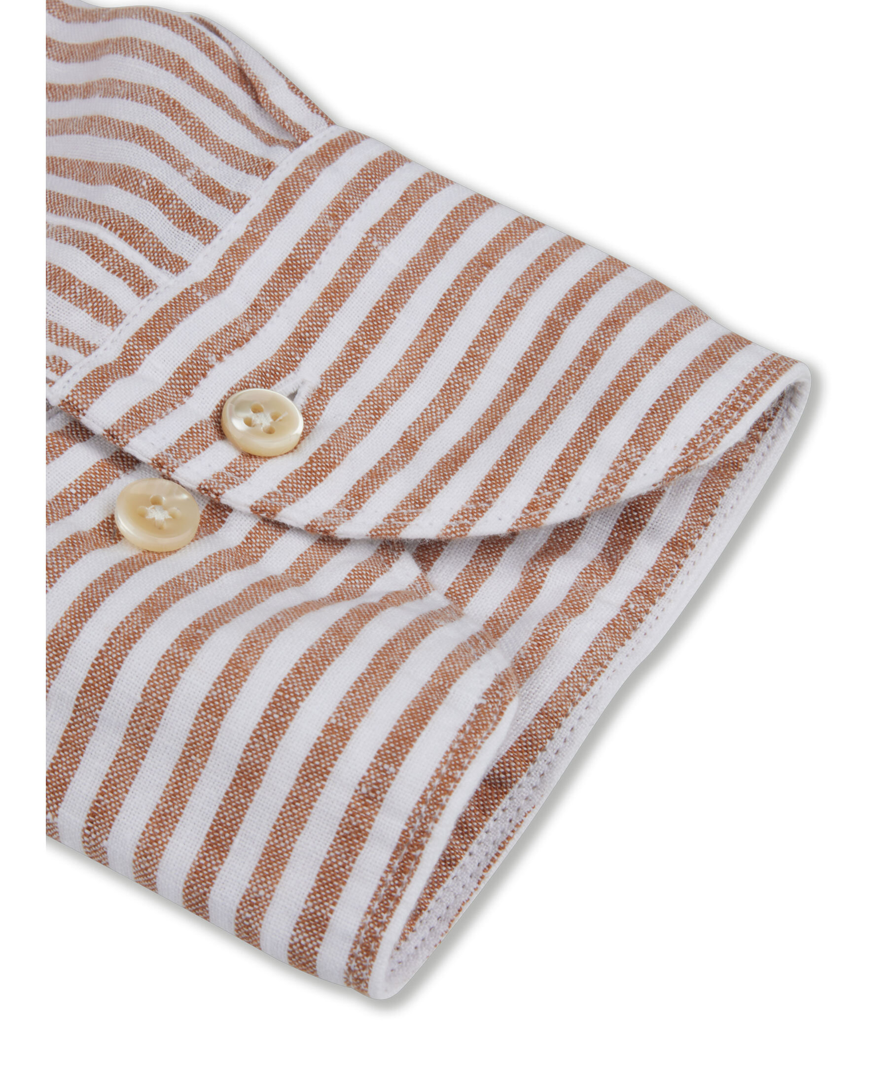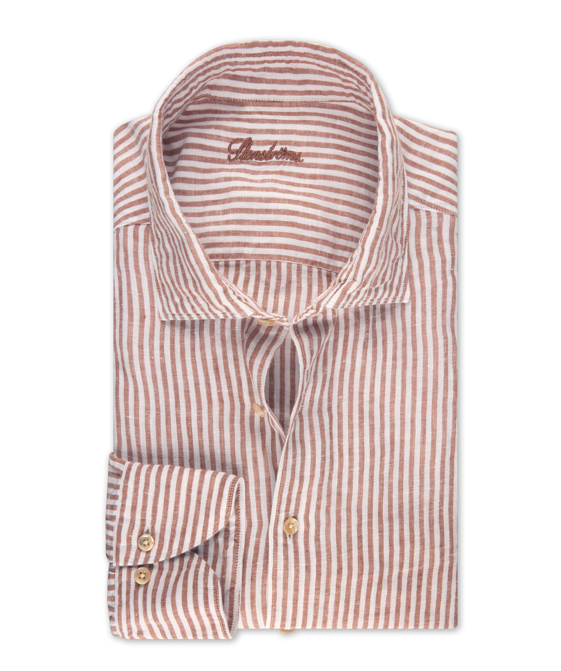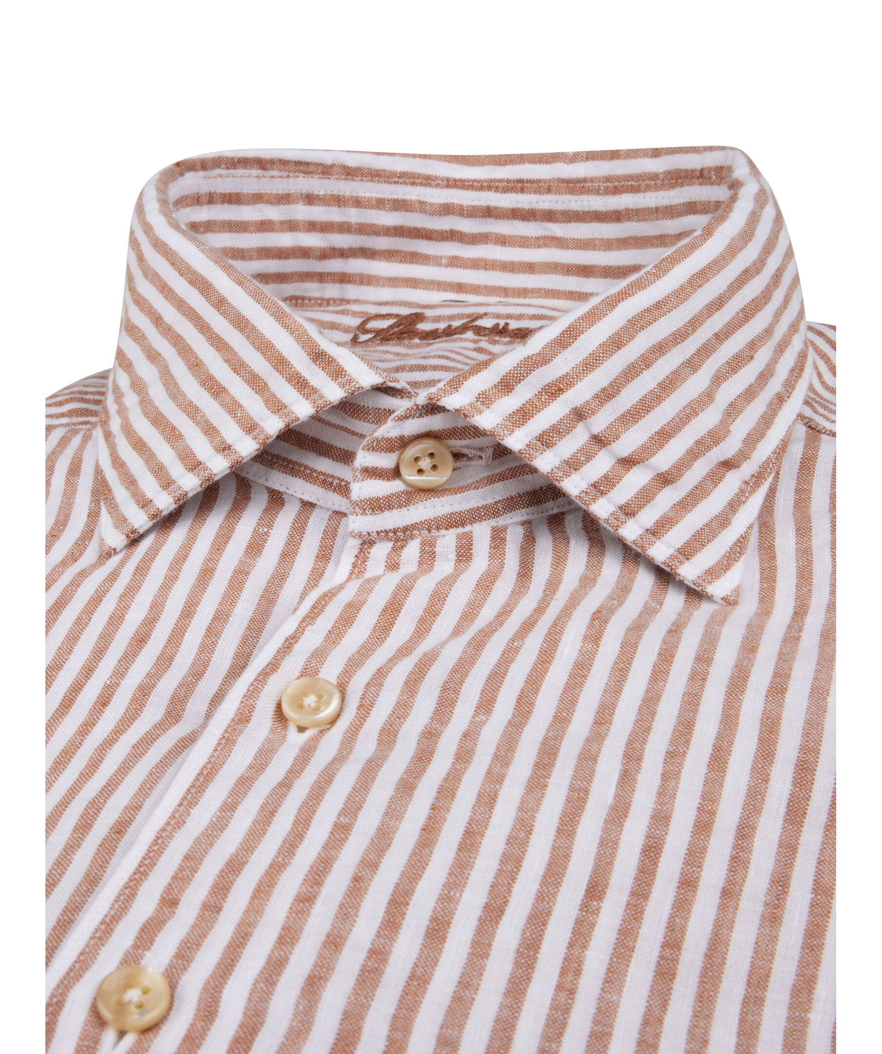 Denna randiga skjorta är tillverkad av linne och har pärlemorknappar, enkla manschetter och en cut away krage.