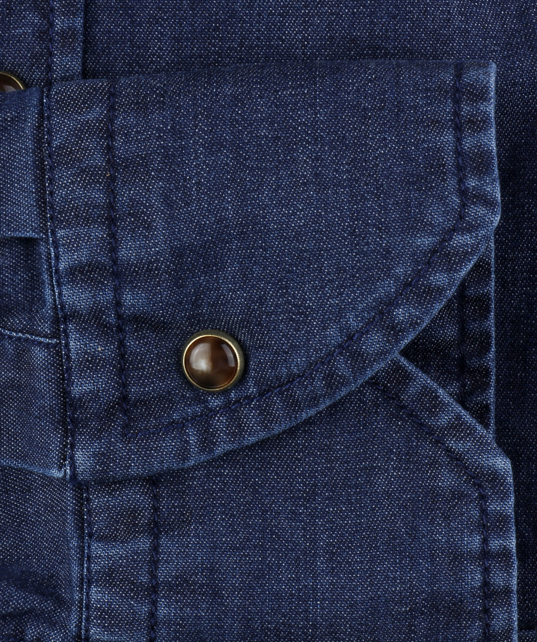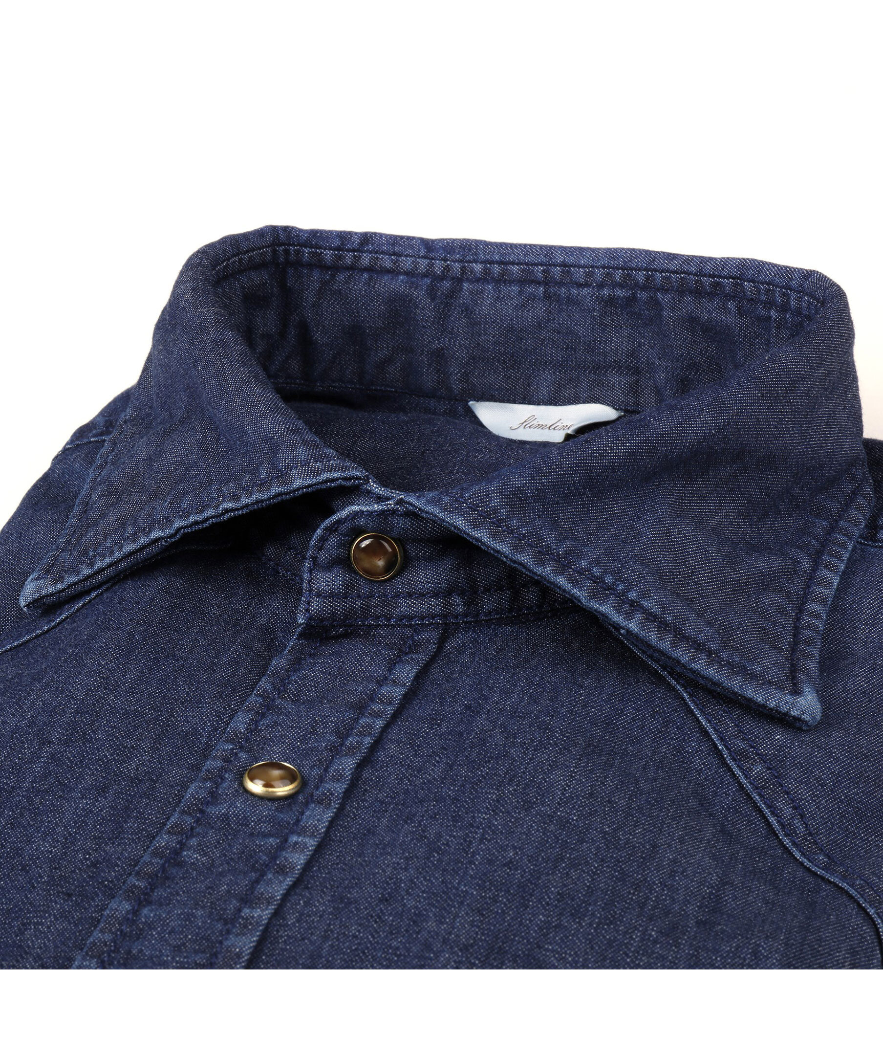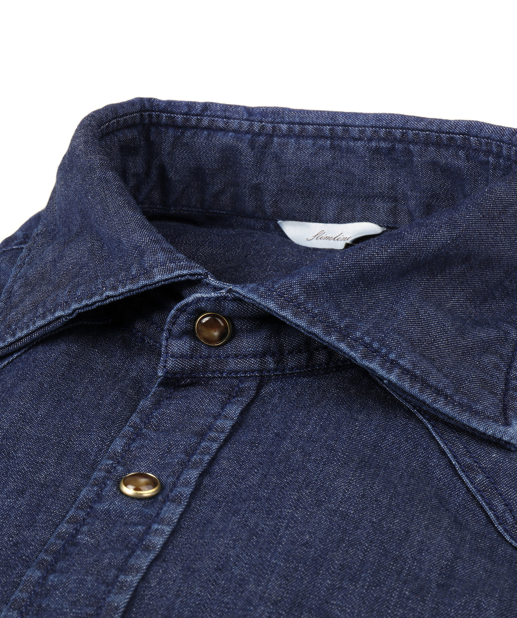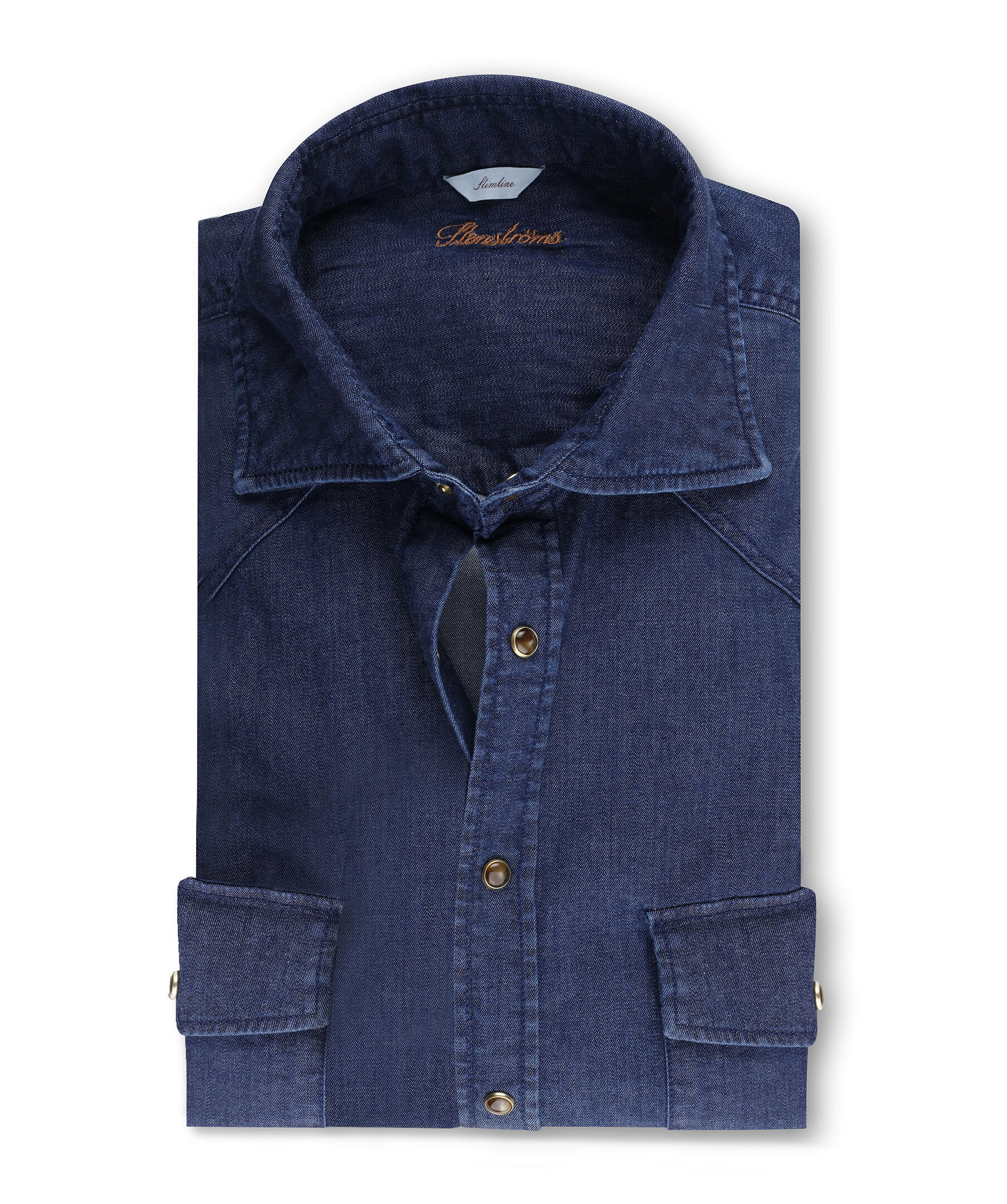 Mörkblå jeansskjorta från Stenströms. Slimline modell i tvättad denim med detaljer som dubbla bröstfickor med lock, stiliserat ok som sträcker sig från ryggen över axeln ner på bröstet. Knäppning med tryckknappar och en cutawaykrage. Tillverkad i stretchig bomull.