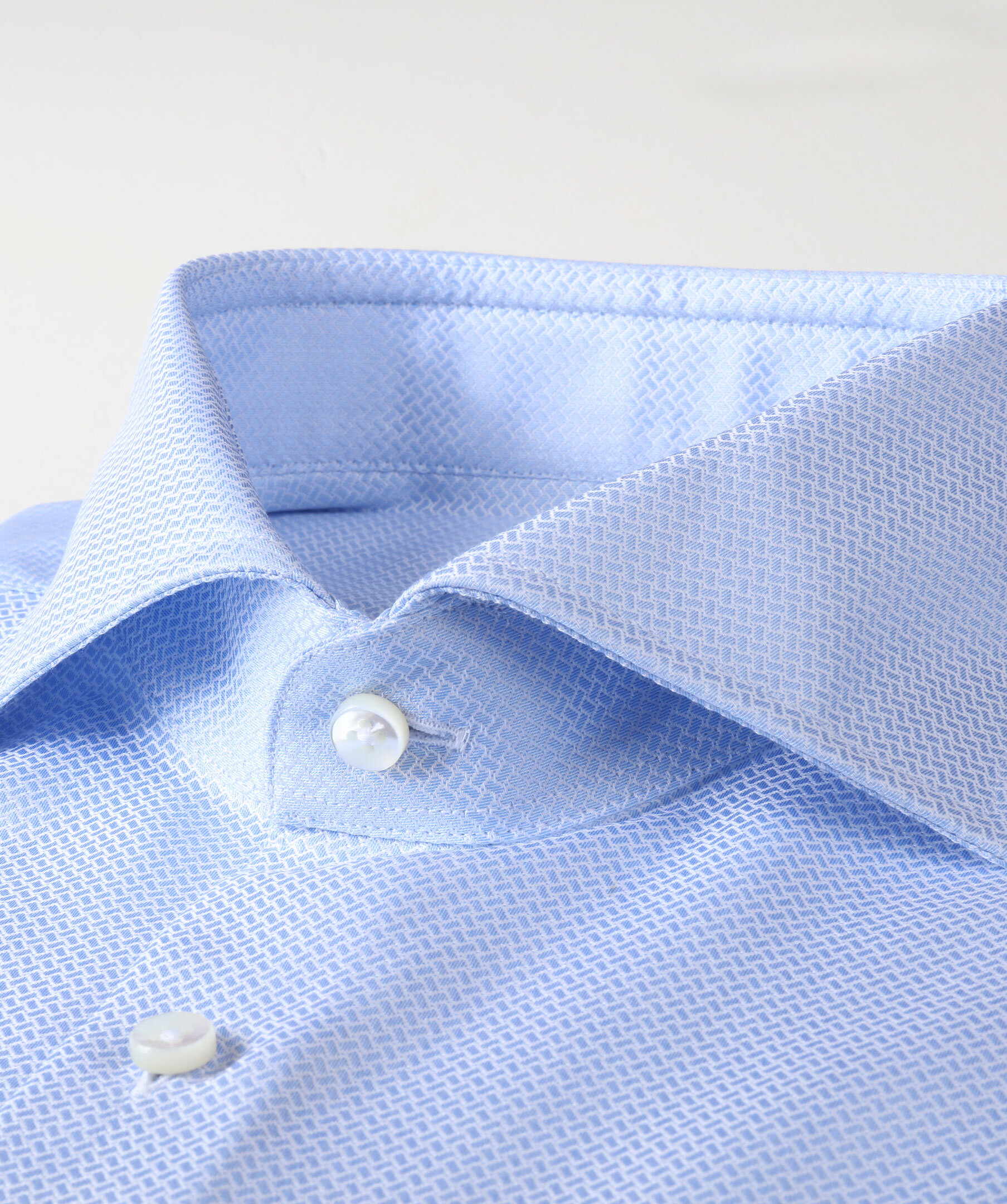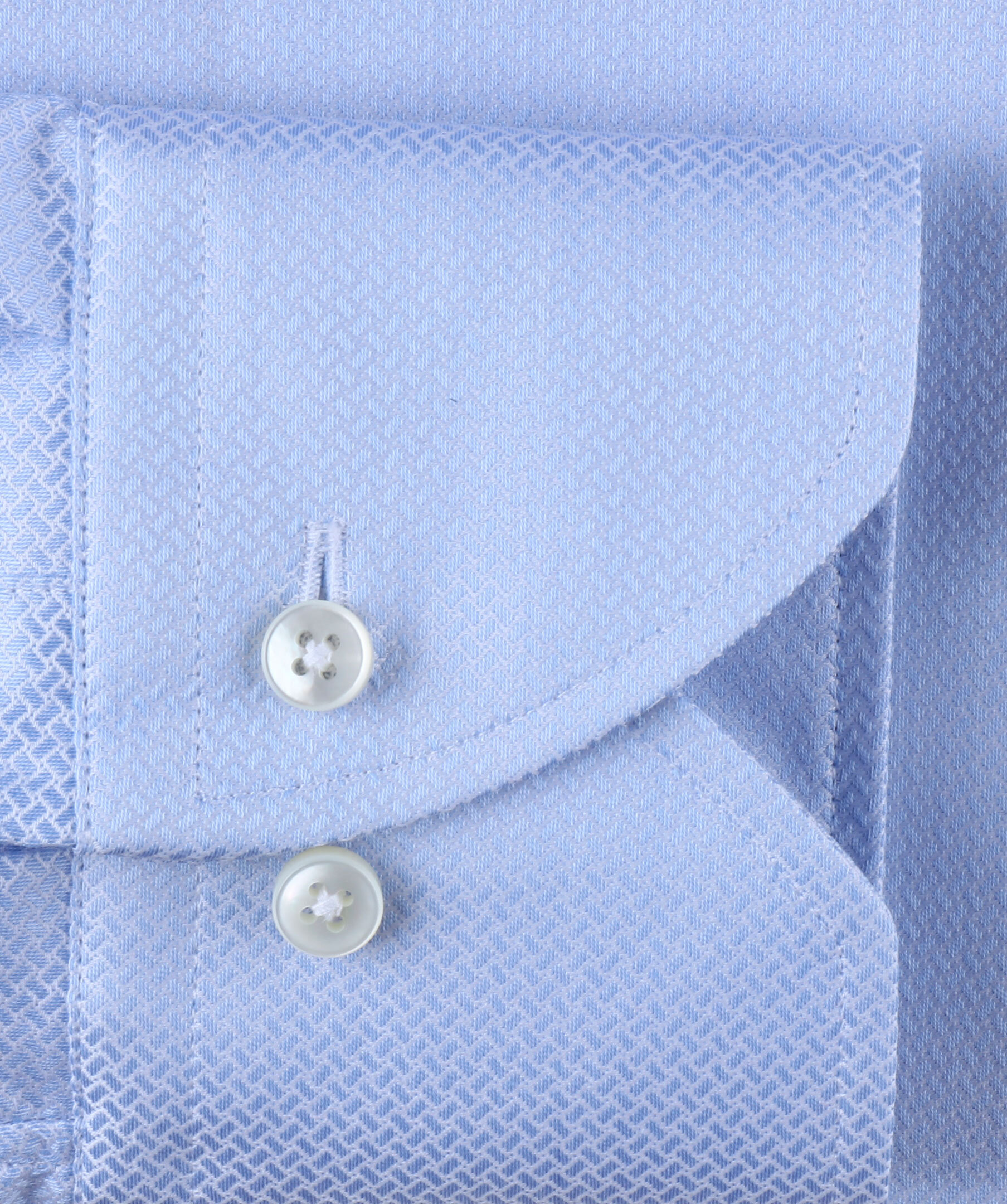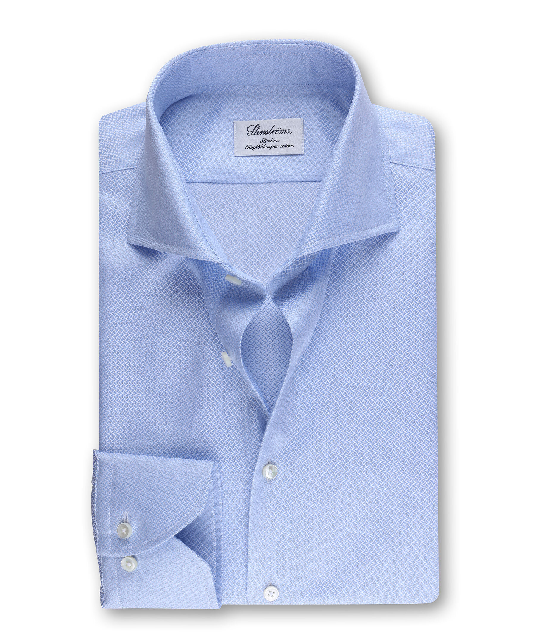 Blå skjorta i modell Slimline tillverkad i dubbeltvinnad (twofold) twill med textur. Skjortan har en krage i modell cut away, enkla justerbara manschetter och pärlemorknappar.