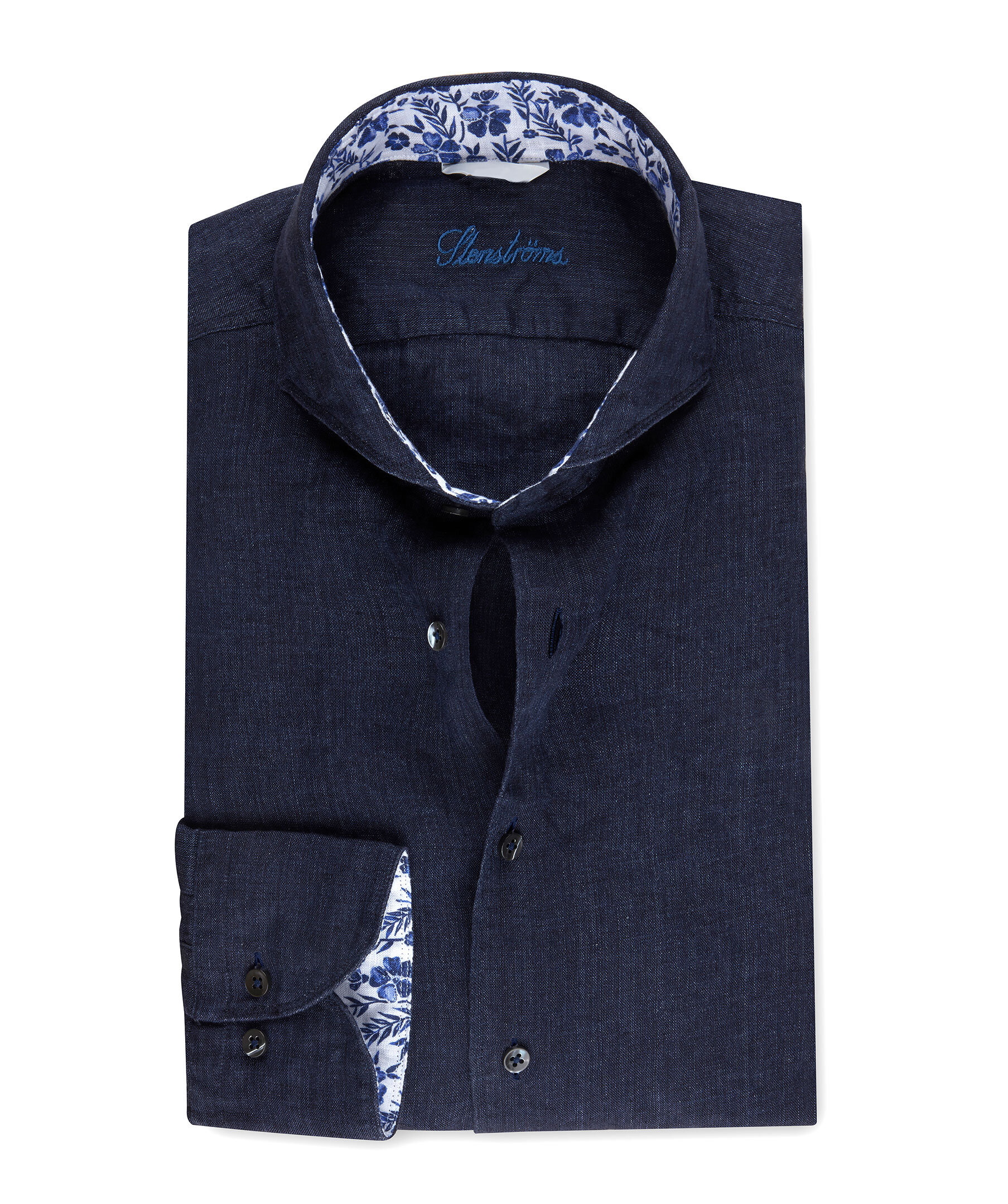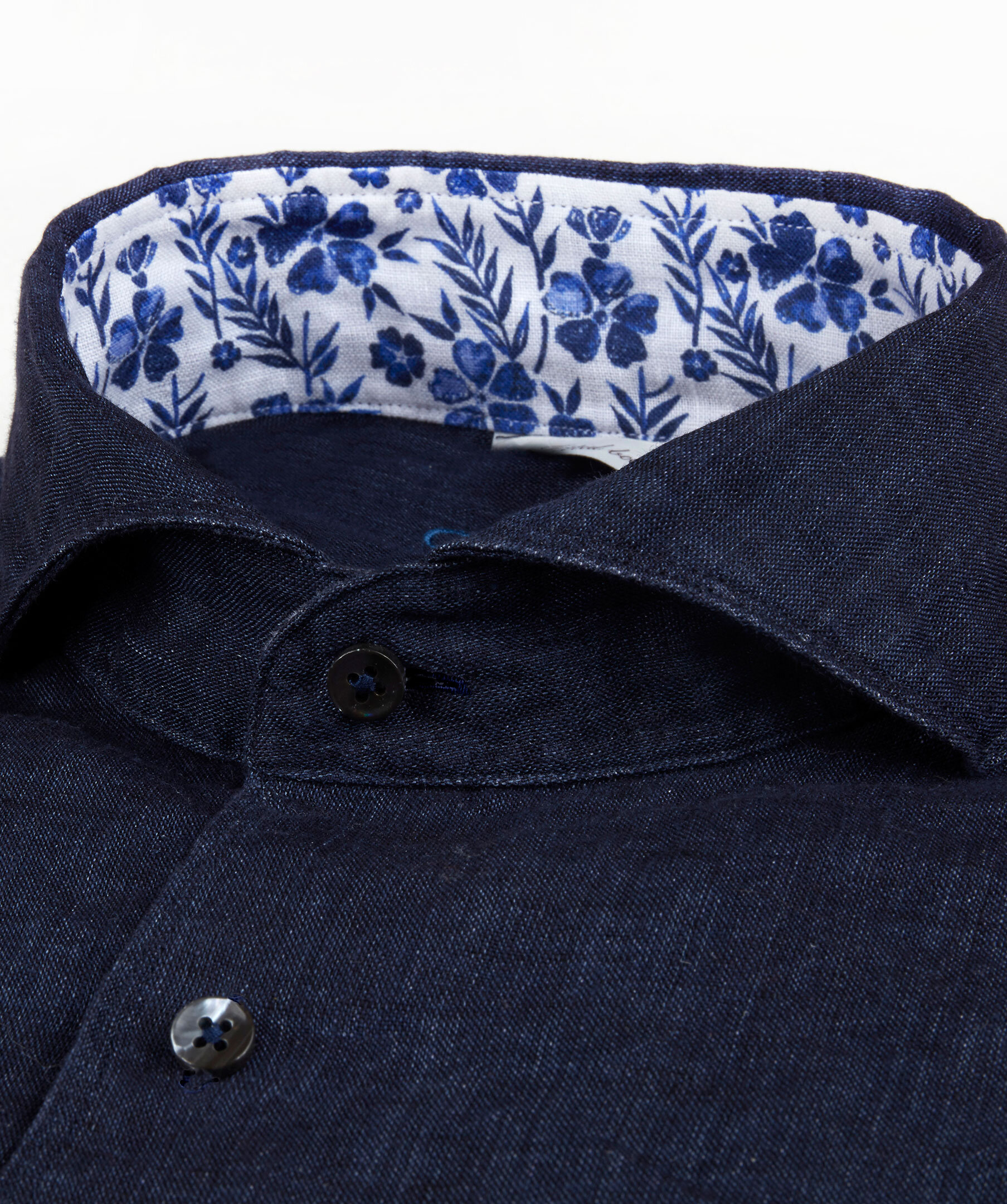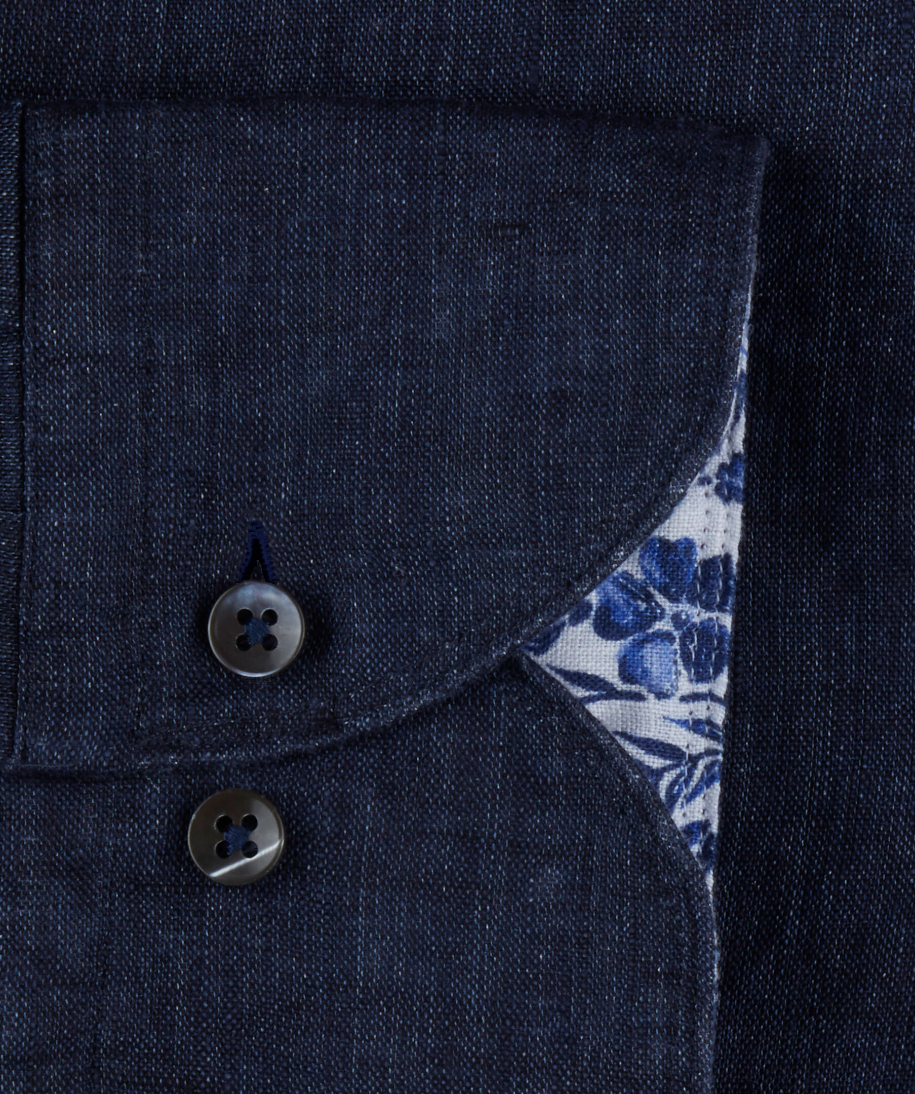 Linneskjortan är det idealiska plagget för varma sommardagar och kan bäras både på kontoret och på stranden. Den här skjortan har ett mönstrat kontrasttyg i krage och manschetter samt mörkgrå pärlemorknappar med marinblå knapptråd. Rulla upp ärmarna och bär skjortan till ett par shorts eller ett par jeans för en avslappnad stil.