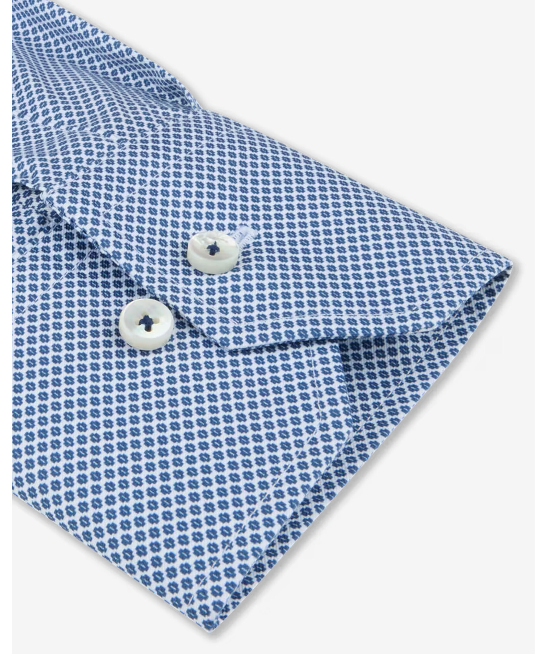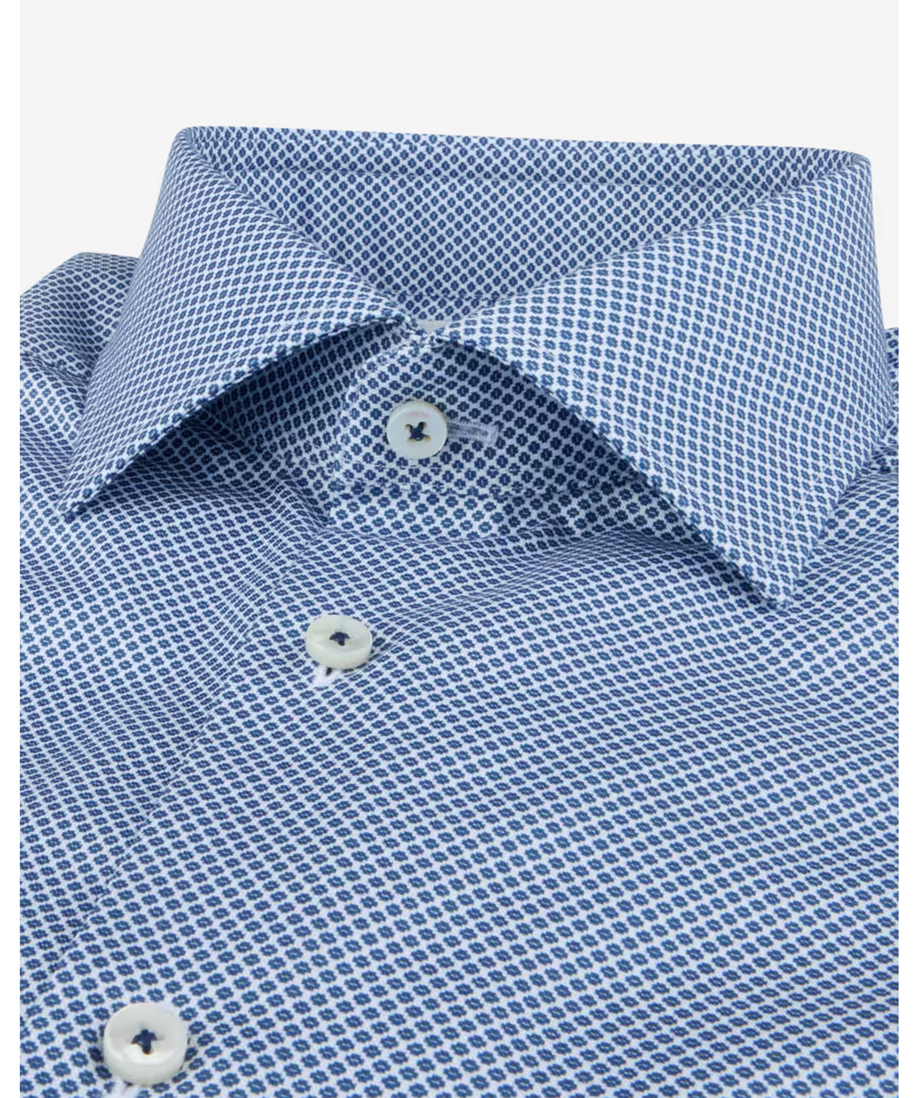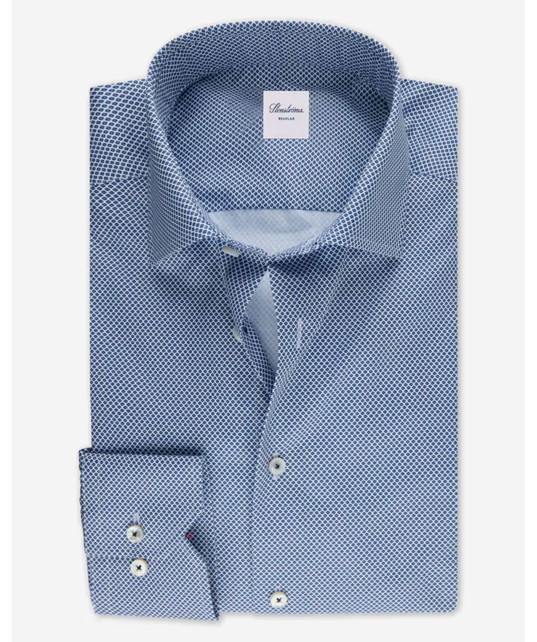 Marinblå mönstrad twillskjorta från Stenströms. Skjortan har mönstertryck på marinblå twill, cut-away-krage och enkelmanschett. Tillverkad i högkvalitativ bomull, med twillvävd textur som ger ett mjukt fall. Pärlemorknappar fram och kontrastdetaljer i krage och manschett. En skjorta som passar både till kostym och casual look.