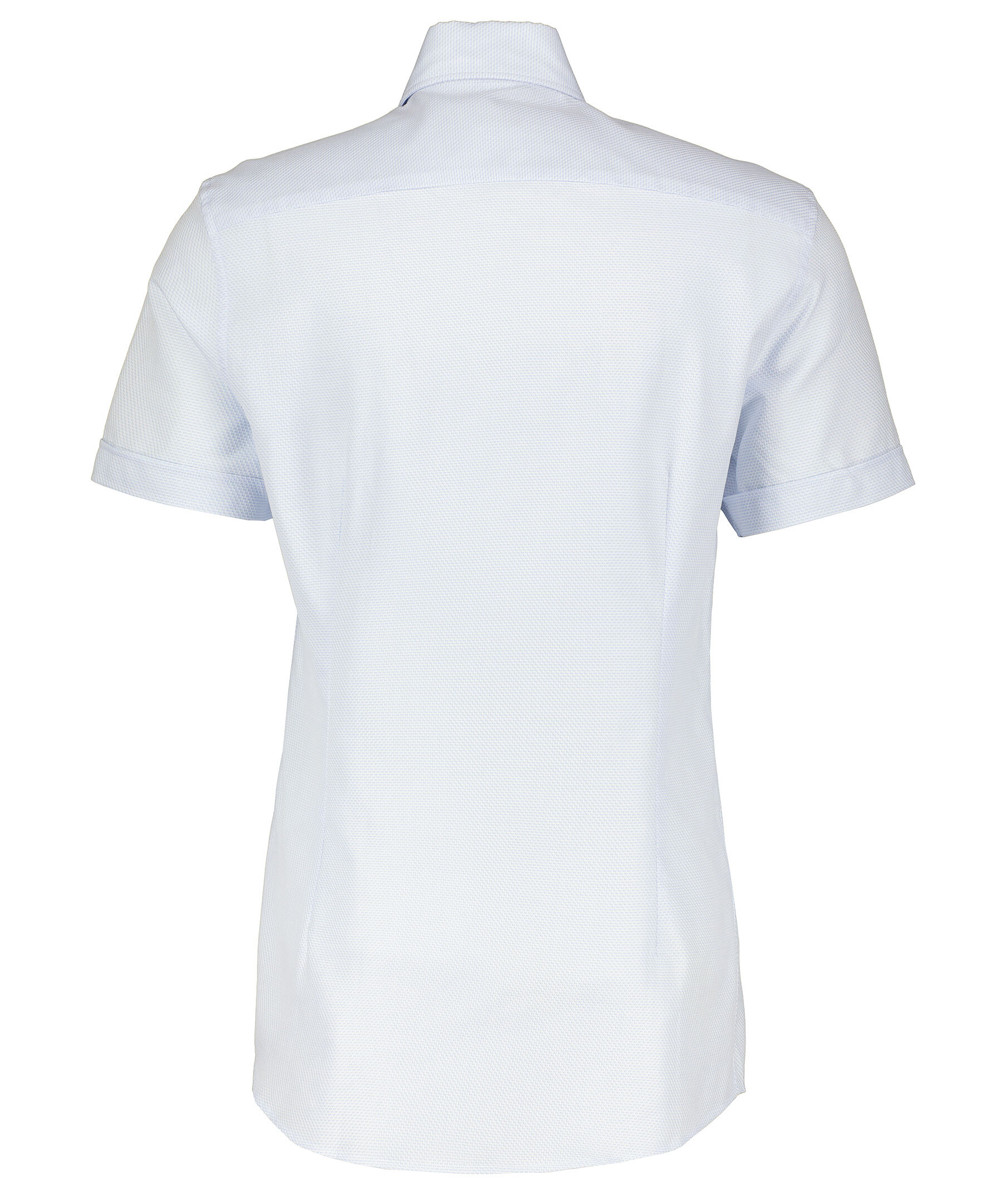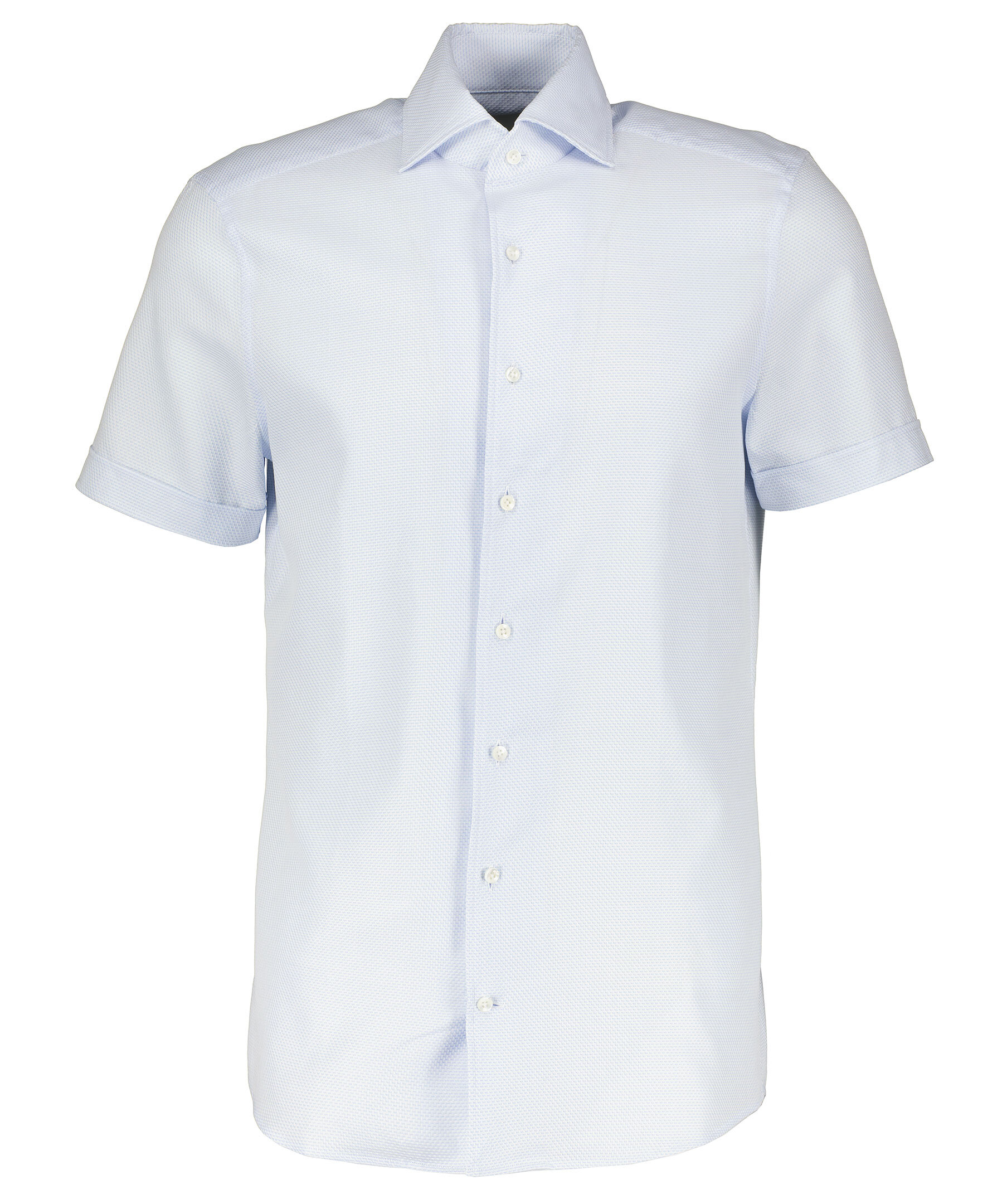 Ljusblå och vit kortärmad skjorta från Stenströms. Bomullstyg med struktur. Pärlemor knappar. Spetsig krage.