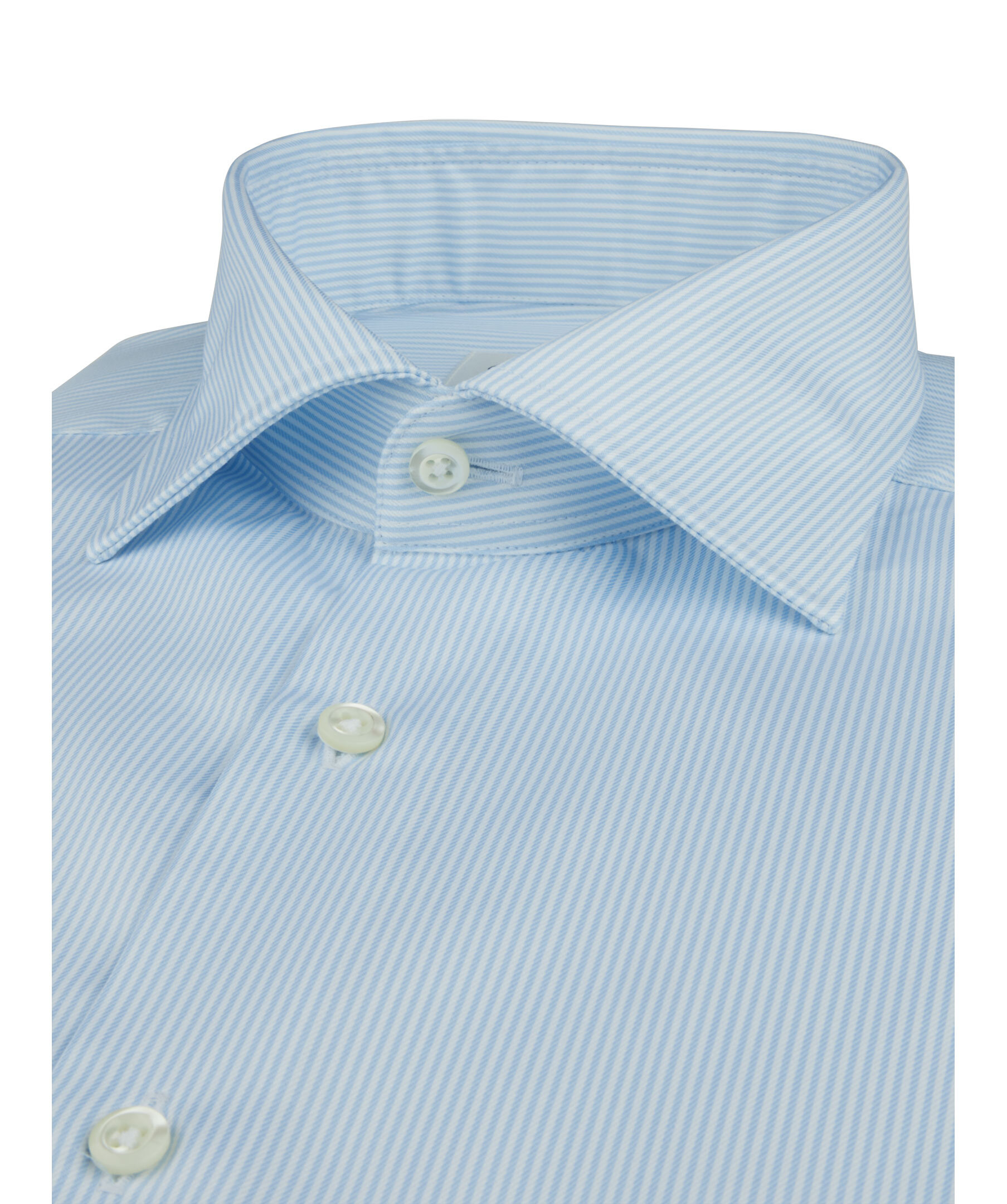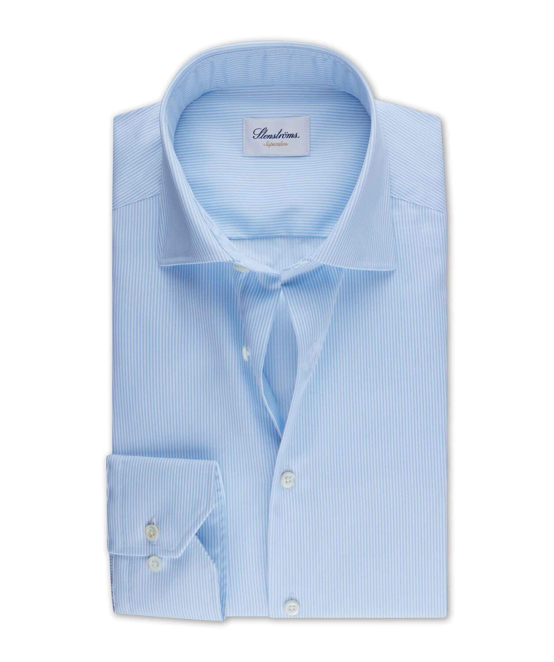 Denna smalrandiga Superslim twillskjorta är tillverkad av twofold bomull. Skjortan har pärlemorknappar, enkla manschetter och en cut away krage.