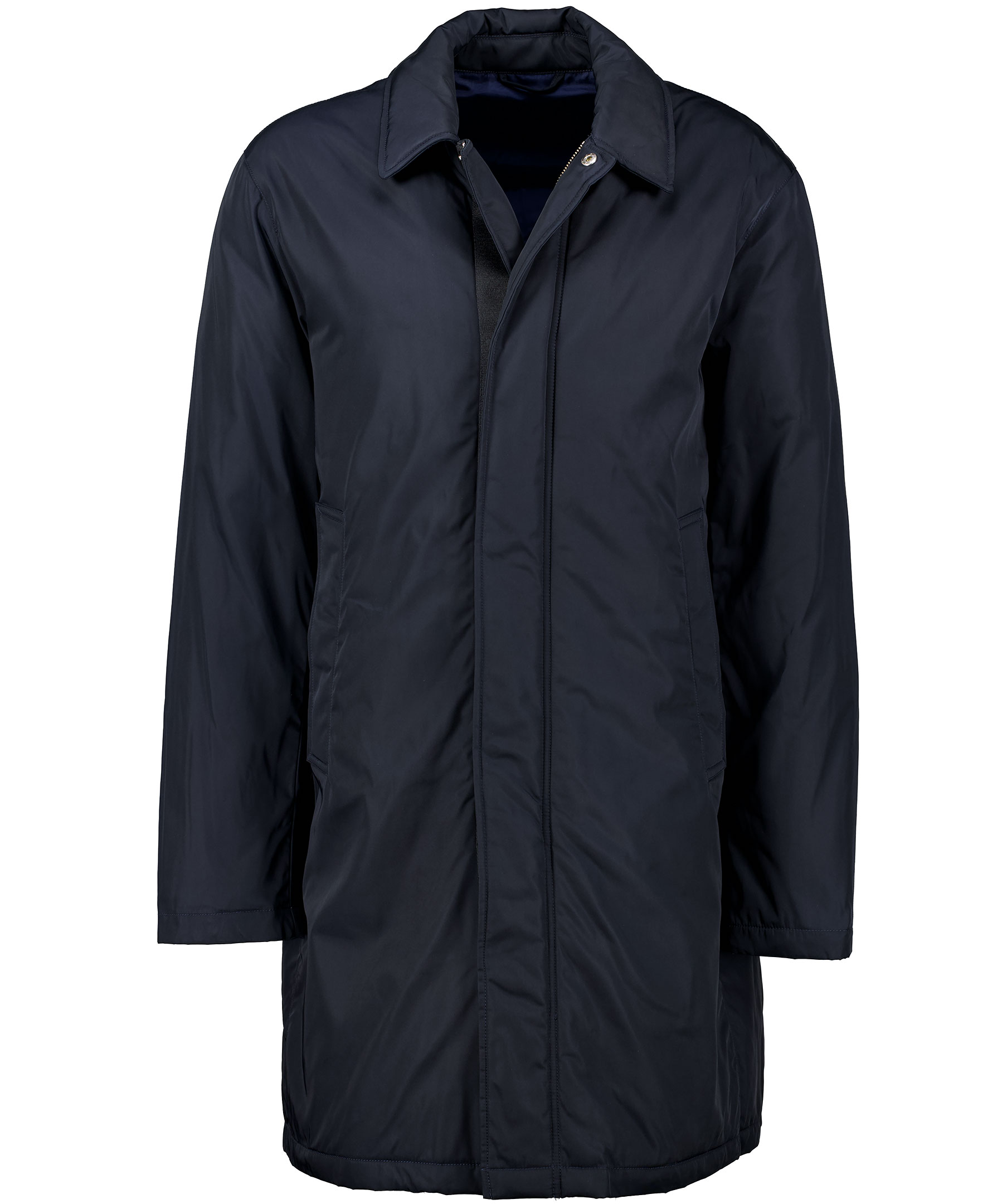 Marinblå, vadderad kappa i återvunnen polyester från Tiger of Sweden. Avslappnad passform, längd över knät