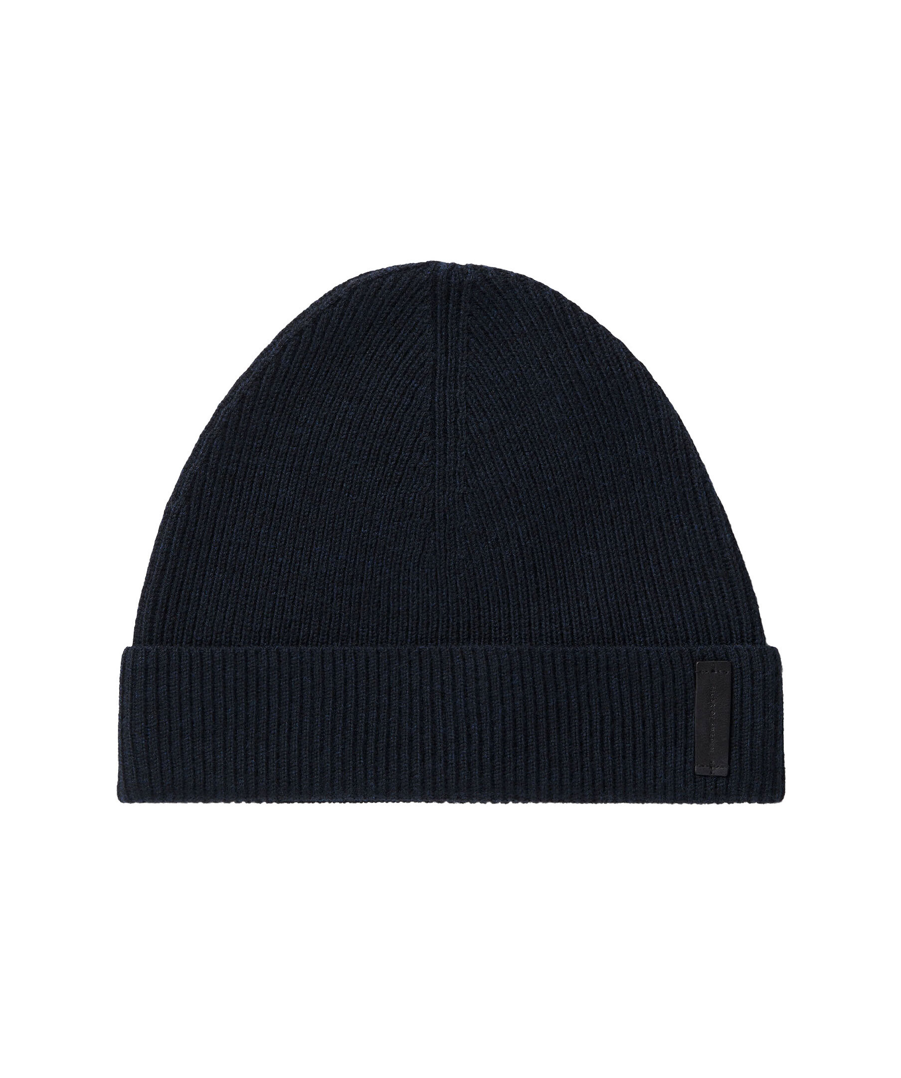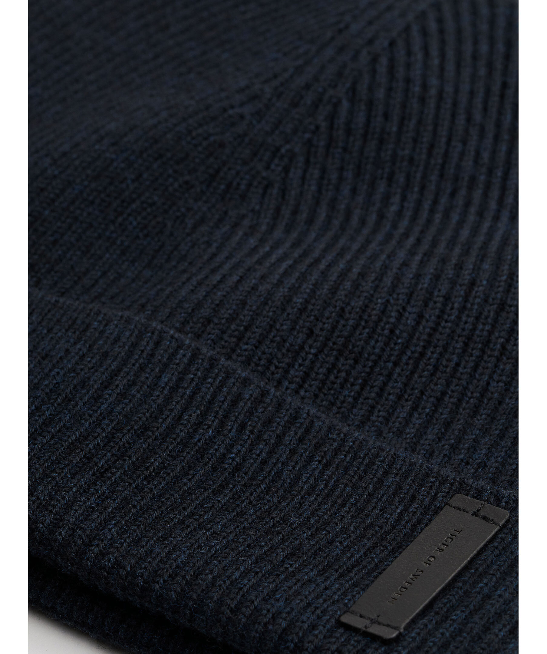 Mörkblå ribbsstickad mössa från Tiger of Sweden. Gjord i en fint ullgarn. Uppvikt kant.
