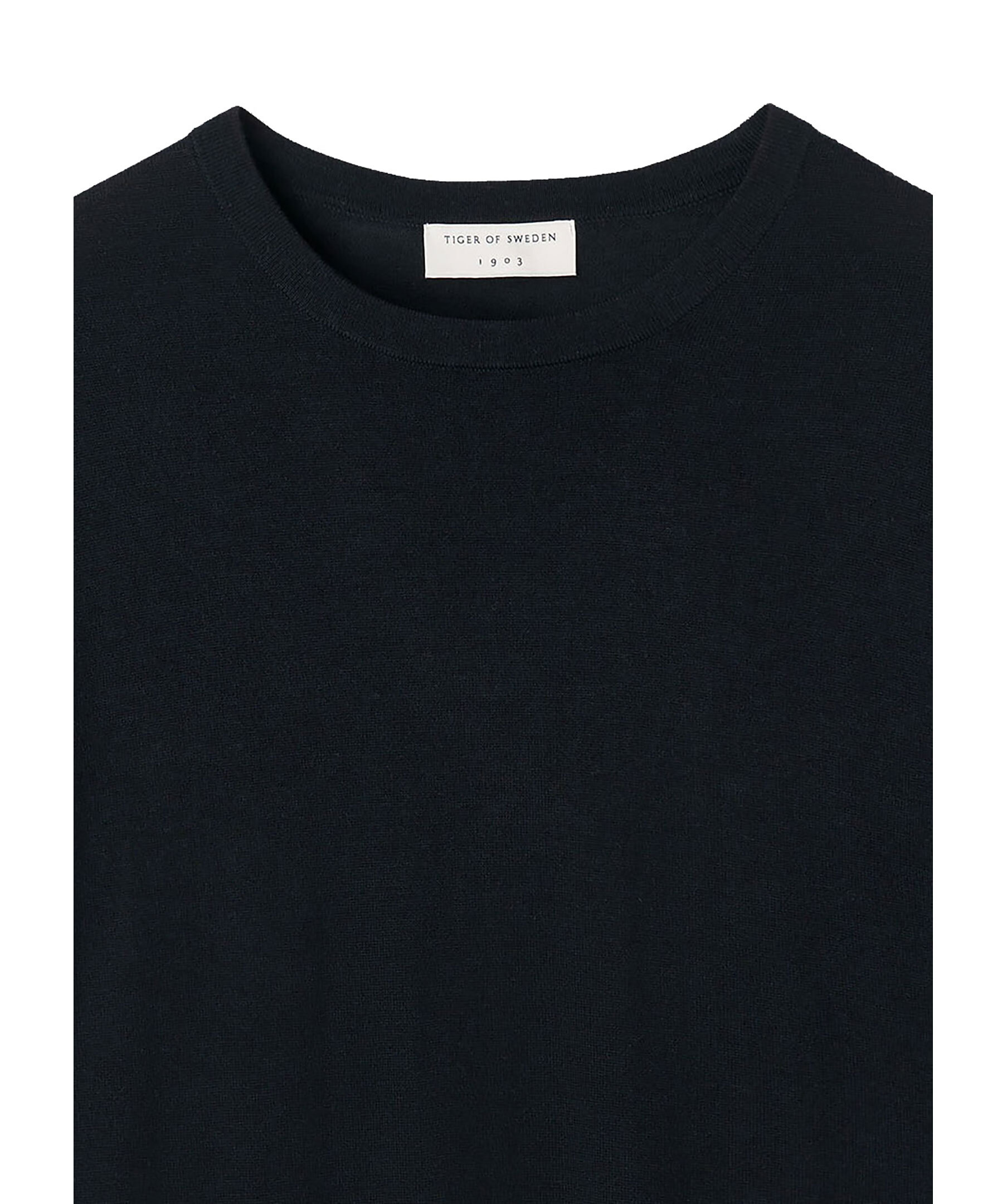 Svart T-shirt från Tiger of Sweden. T-shirten har en regular fit med crew-neck och är stickad. Den har korta ärmar med fransk axel. Ribbstickad mudd vid tröjslut. Tillverkad av merinoull.