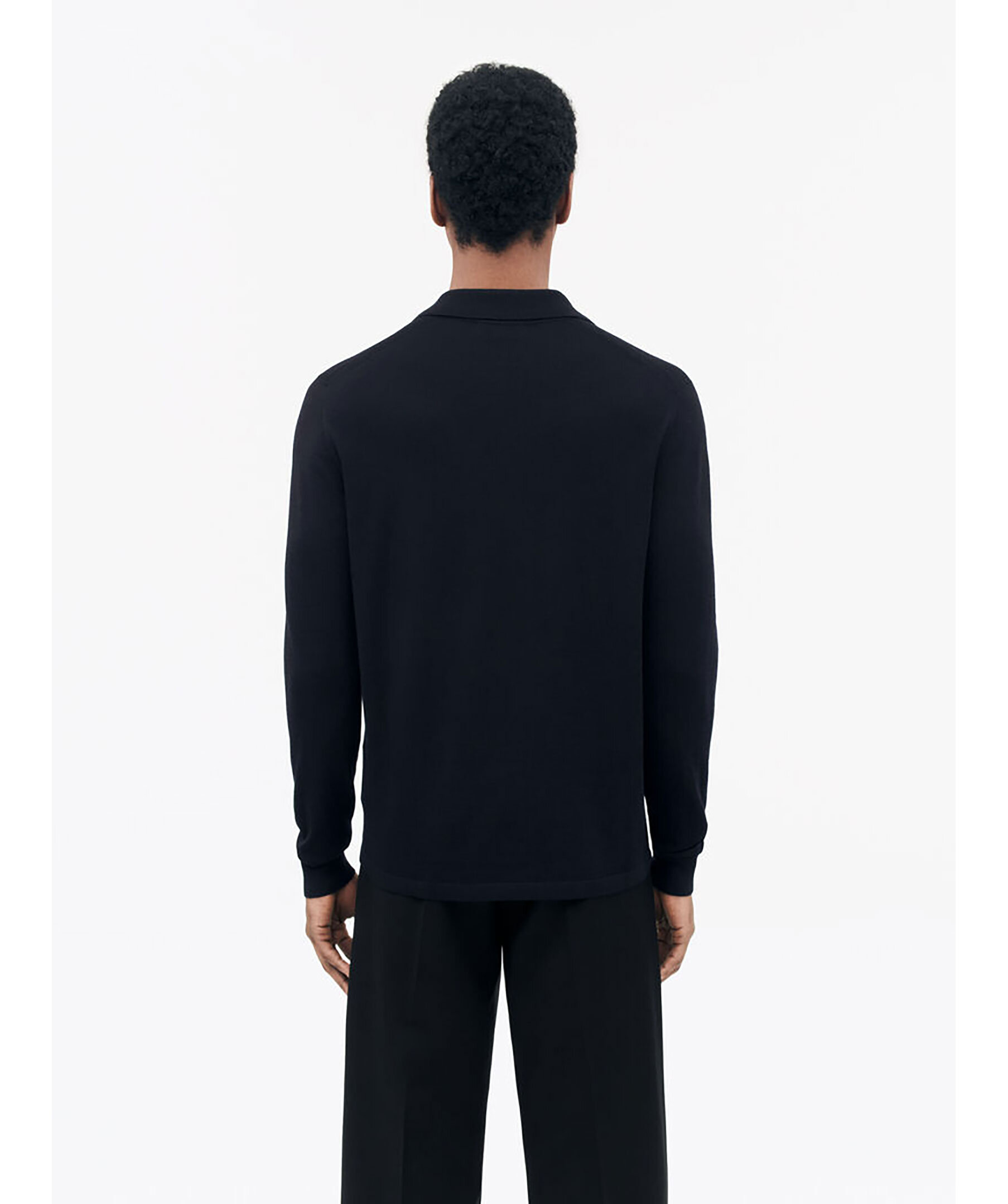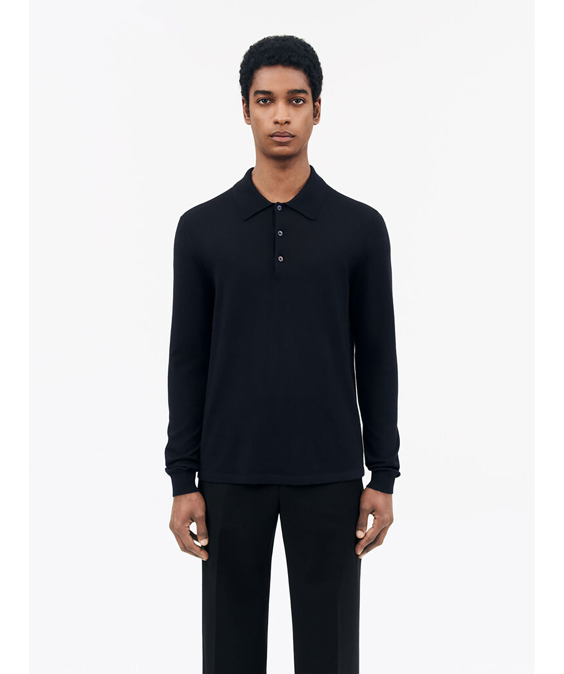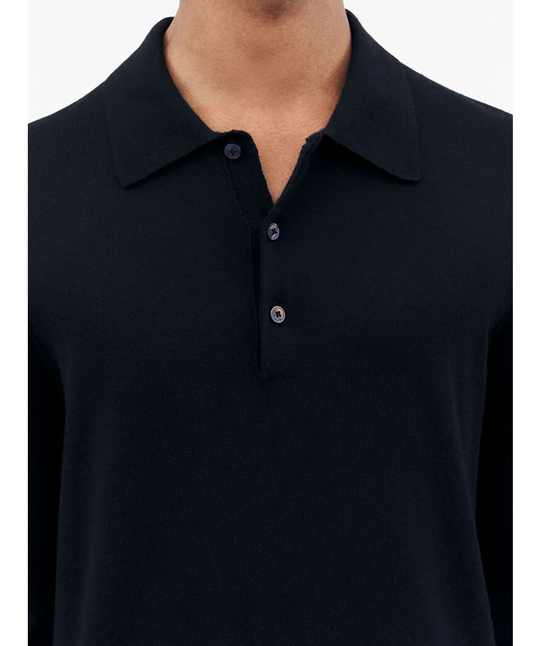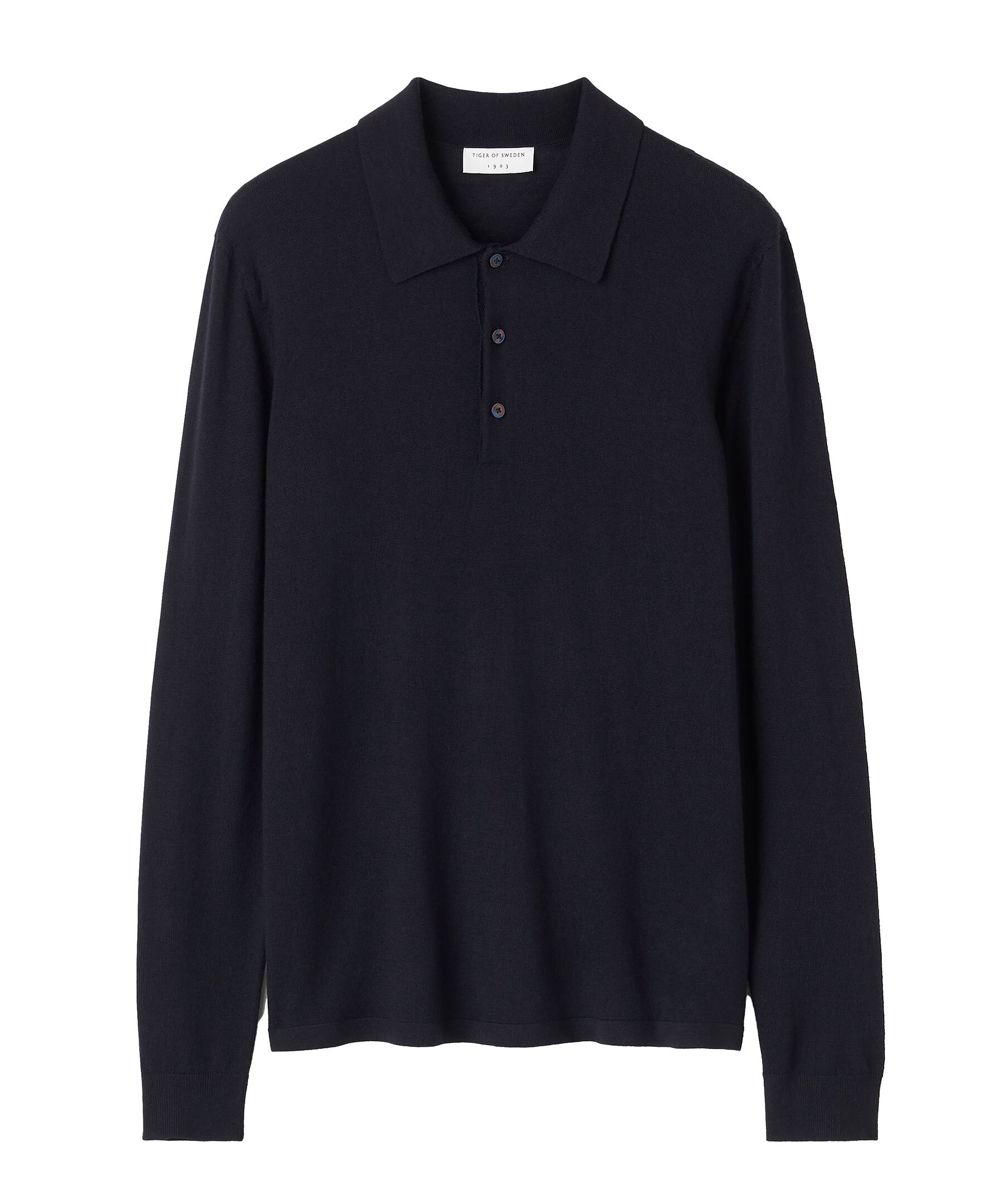 Mörkblå långärmad pikétröja från Tiger of Sweden. Gjord i 100% merioull. Knappslå med knappstängning