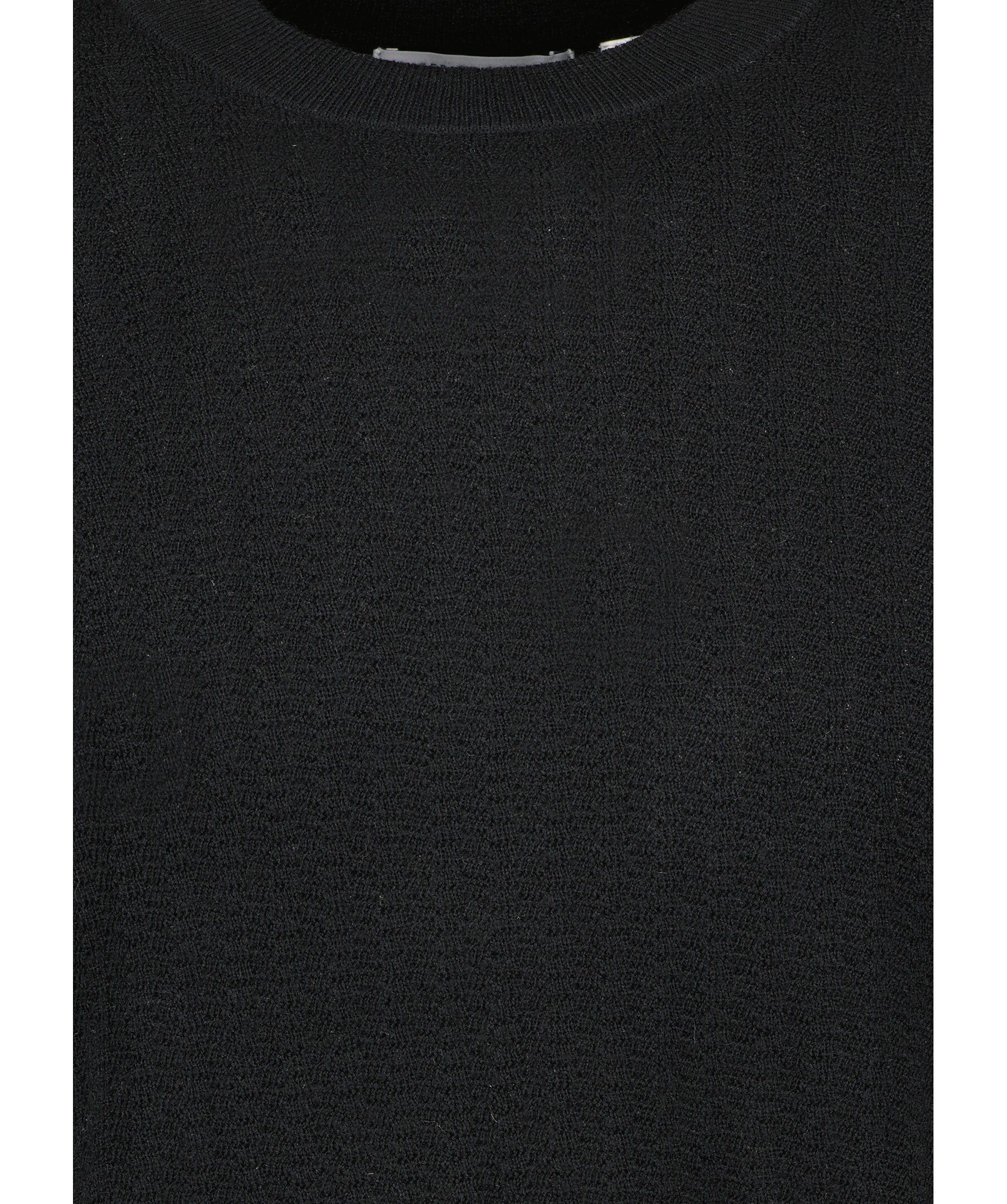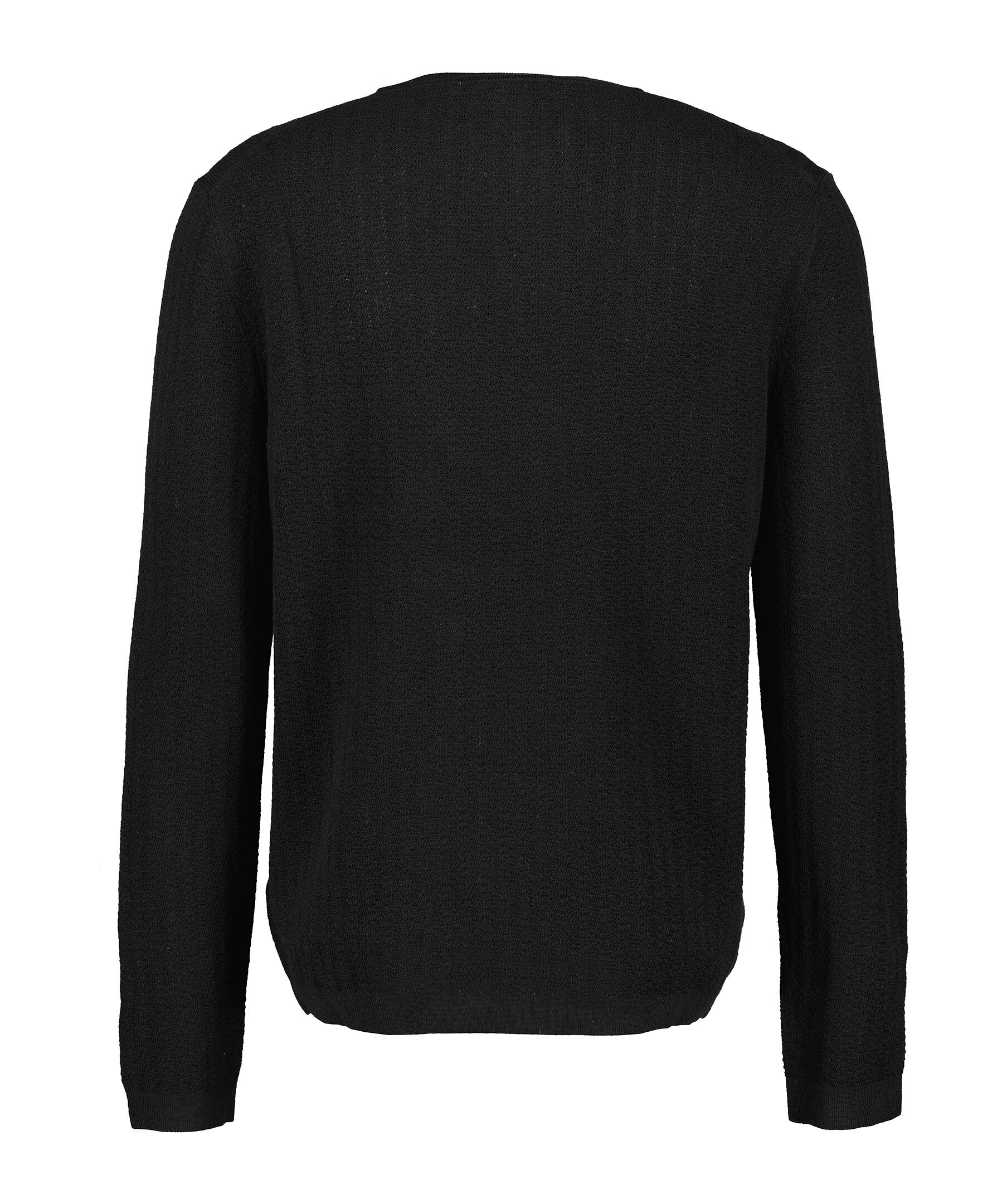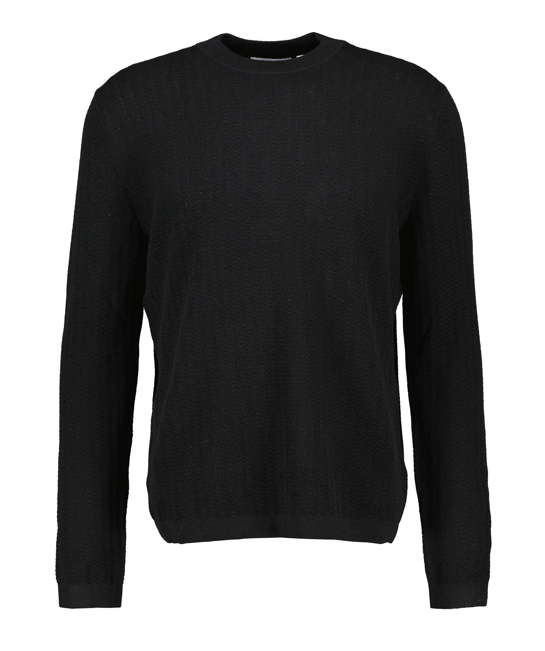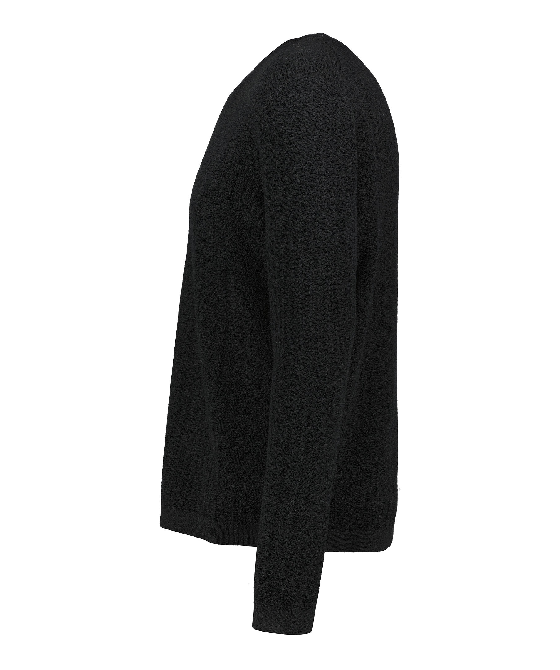 Svart, stickad tröja med struktur från Tiger of Sweden. Tröjan har rund, ribbstickad halsringning samt ribbstickade muddar vid ärm- och plaggslut. Tillverkad i 100% merinoull.
