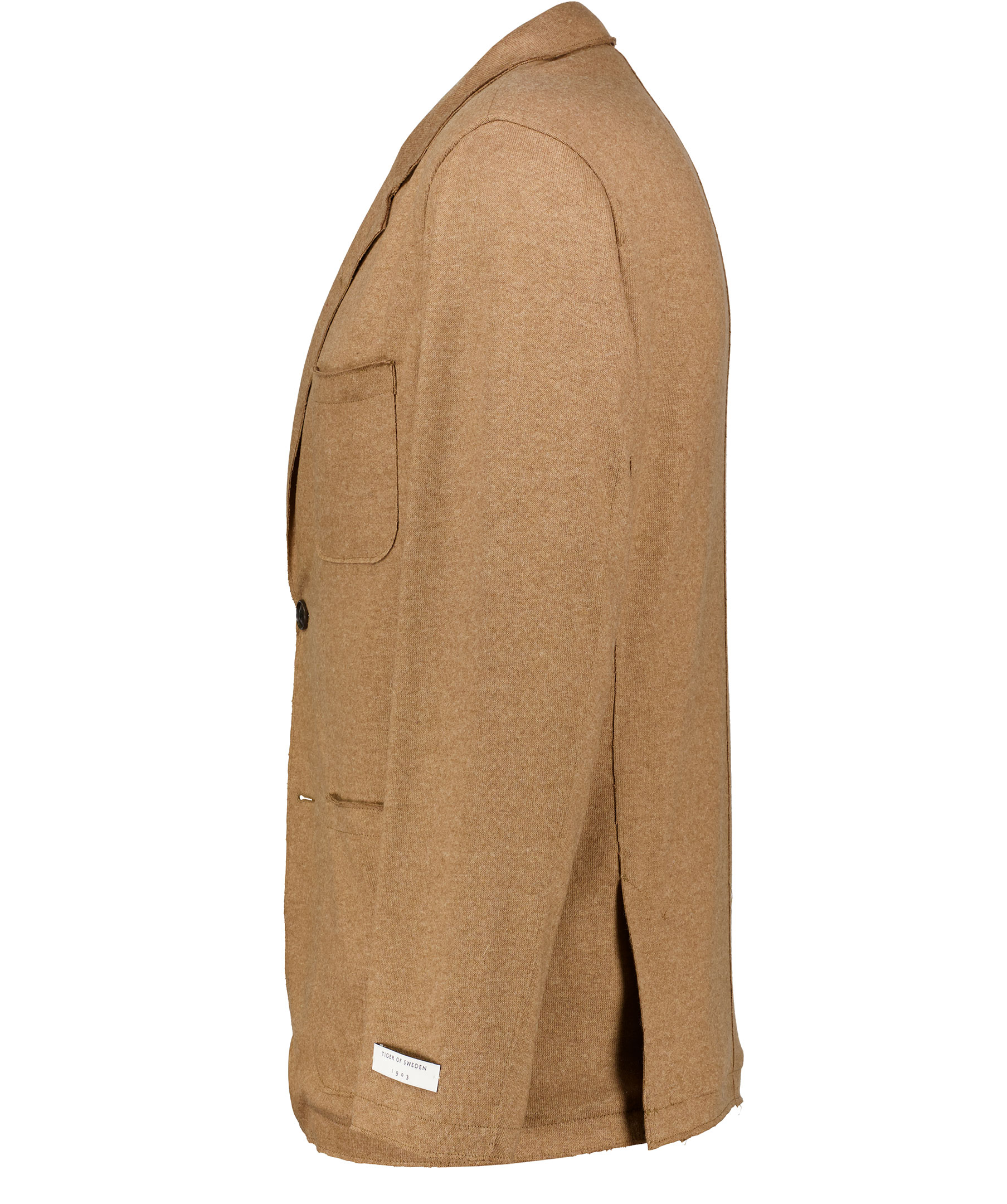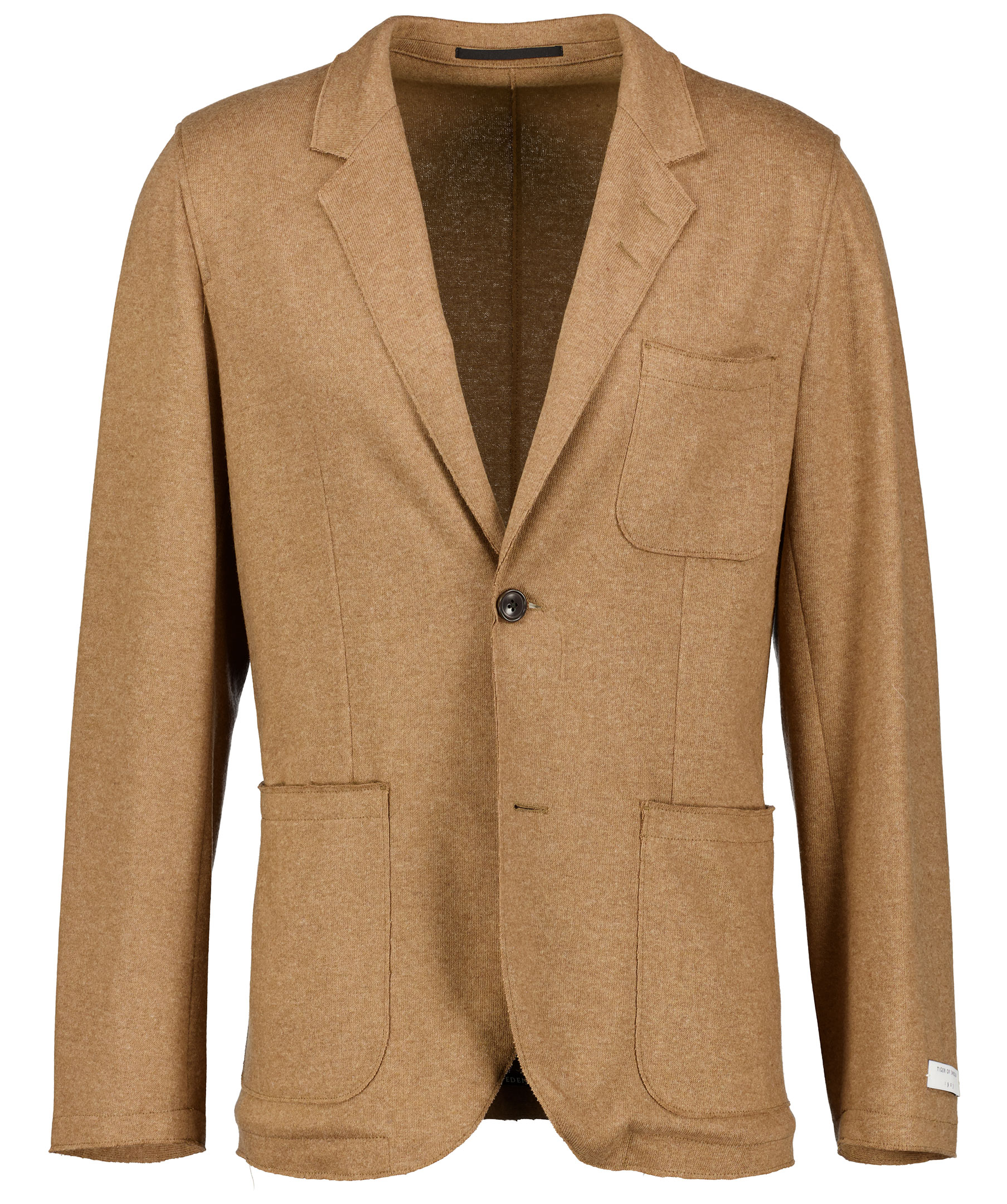 Kamelfärgad blazer i stickad ullblandning från tiger of Sweden. Halvsmal passform, stängning med två knappar och tre lappfickor. Rå kanter och sidoventiler bak.