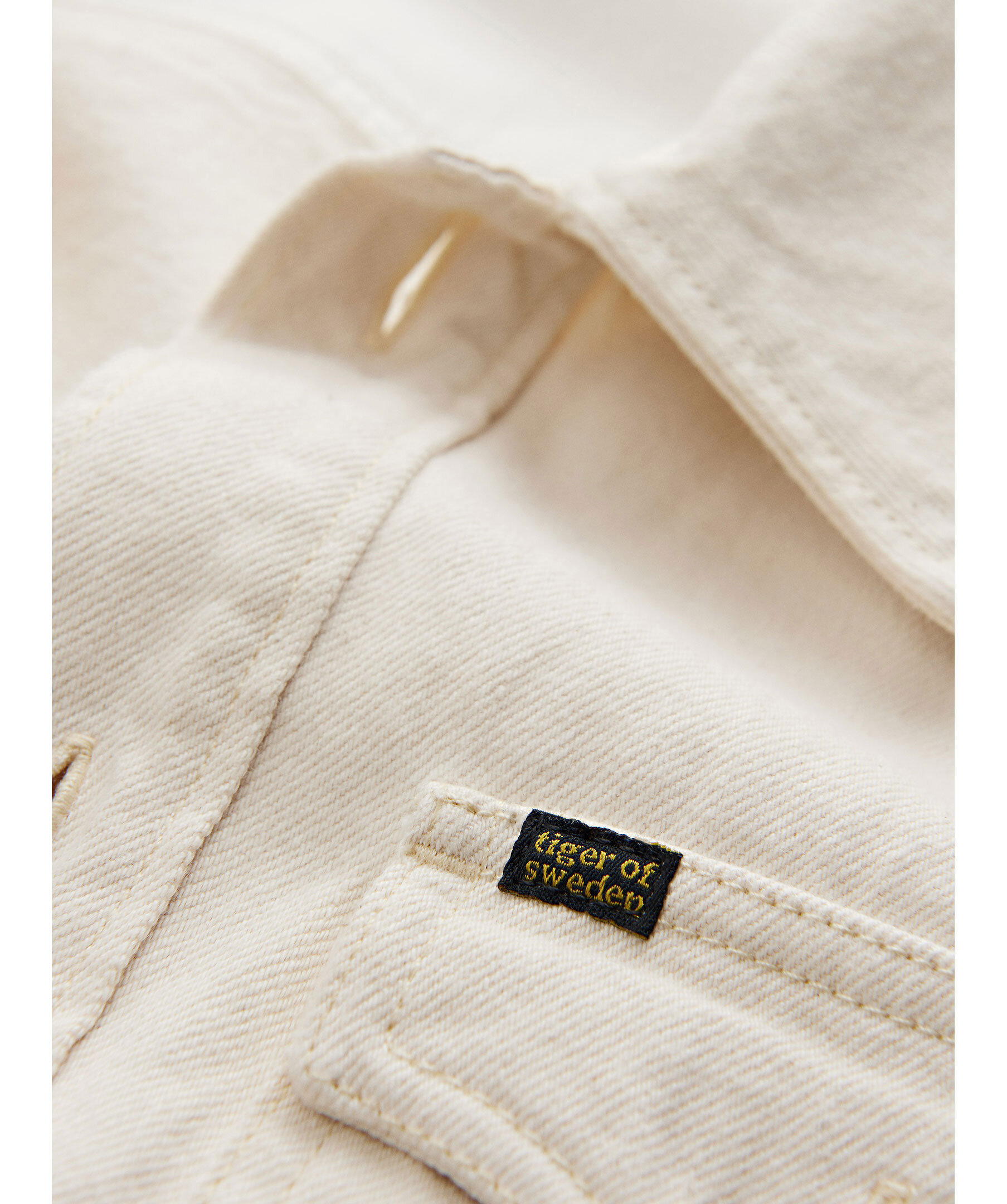 Krämvit jeansjacka från Tiger of Sweden. Normal passform och slutar i höftlängd. Tjock jeanstyg utan stretch. Stängs med knappar framtill, har två bröstfickor med knapp och två sidofickor.