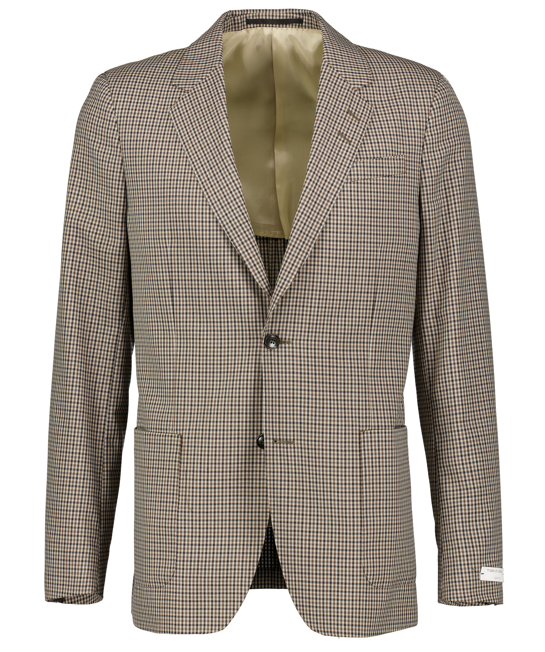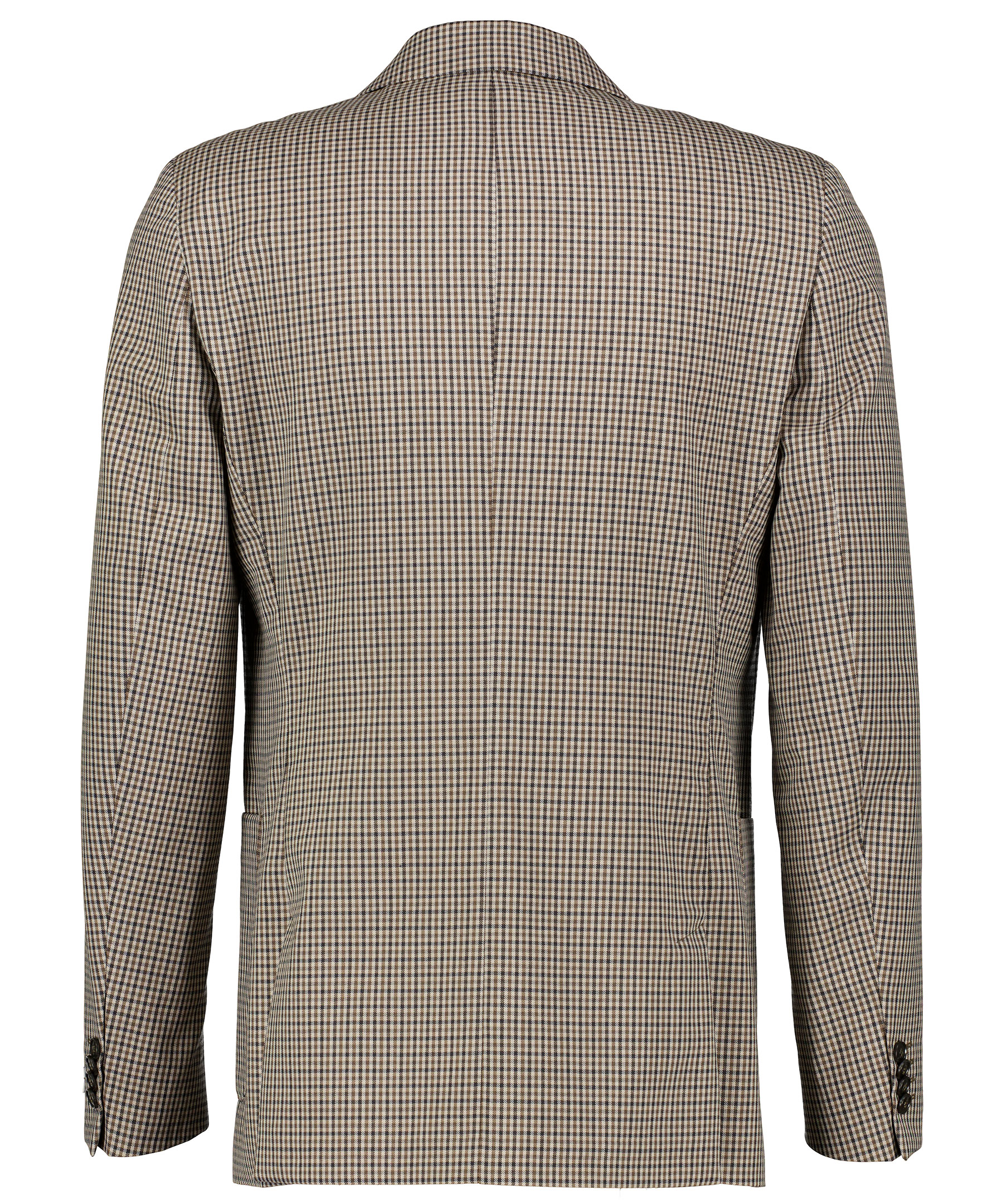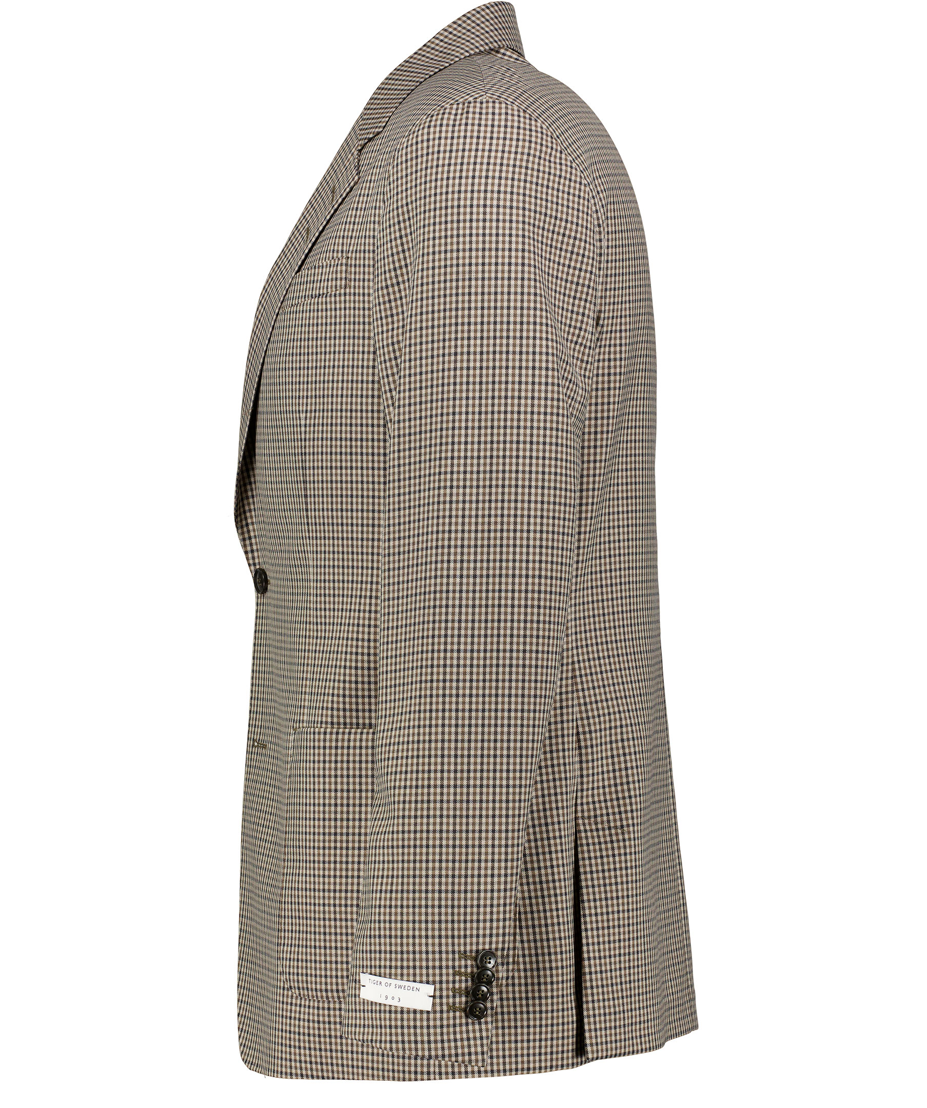 Smårutig kavaj i ullblandning från Tiger of Sweden. Trubbiga slag och dubbla sprund. Fickor med lock och bröstficka fram samt innerfickor och biljettficka. Två mörka knappar fram och fyra knappar längst ner på varje ärmslut.