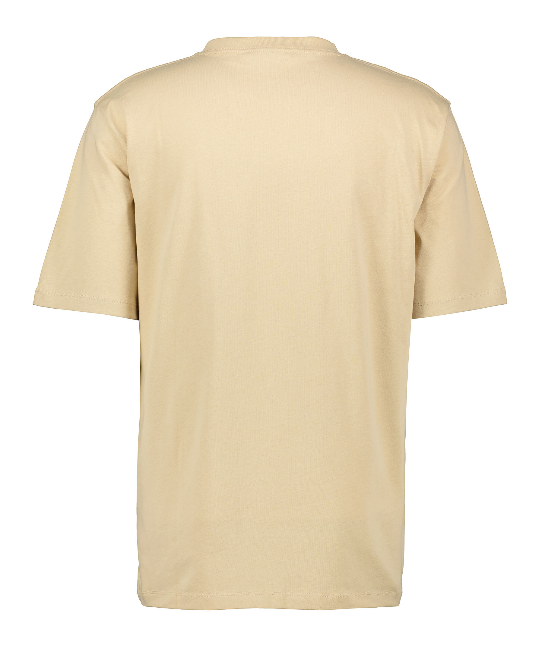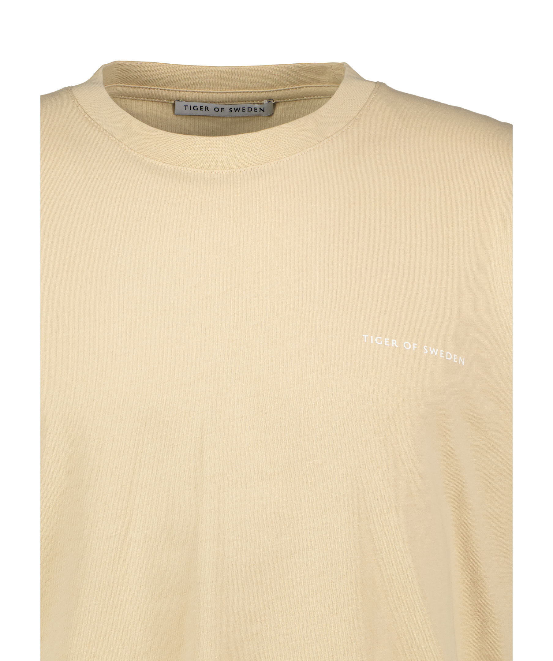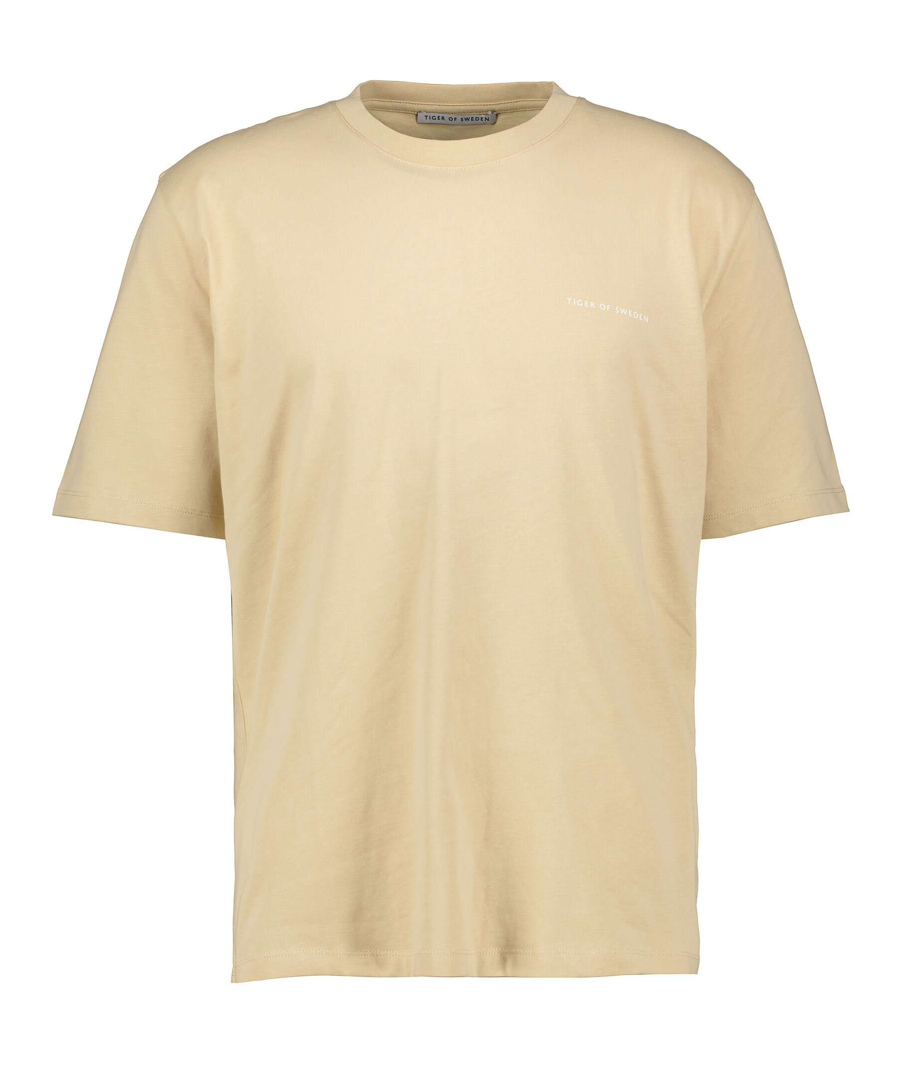 Sandfärgad t-shirt från Tiger of Sweden. Tröjan har ribbstickad halsringning och liten logotyp på bröstet. Tillverkad av 100% bomull.