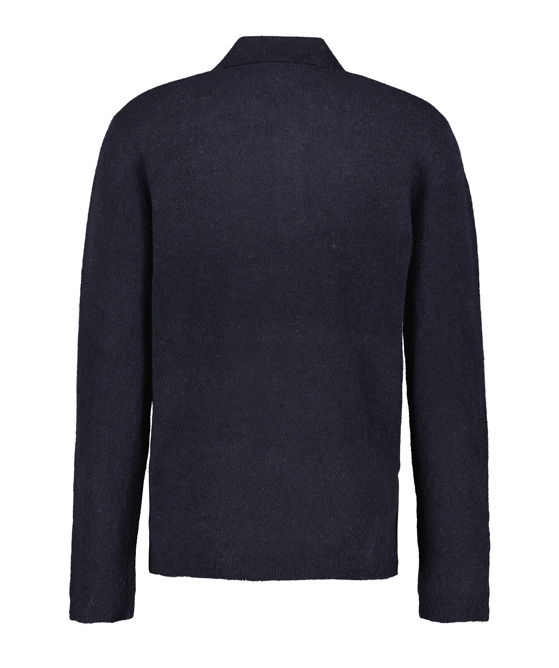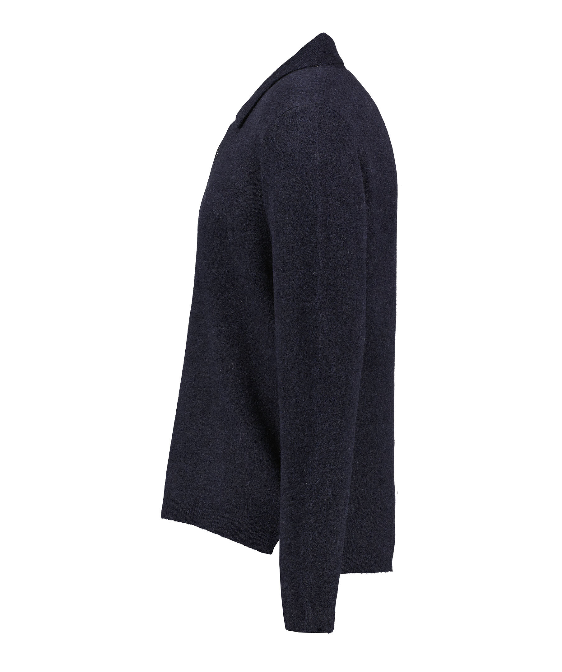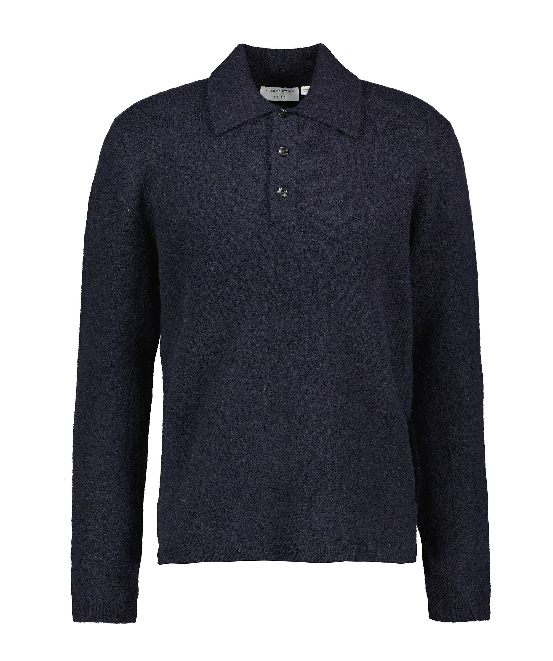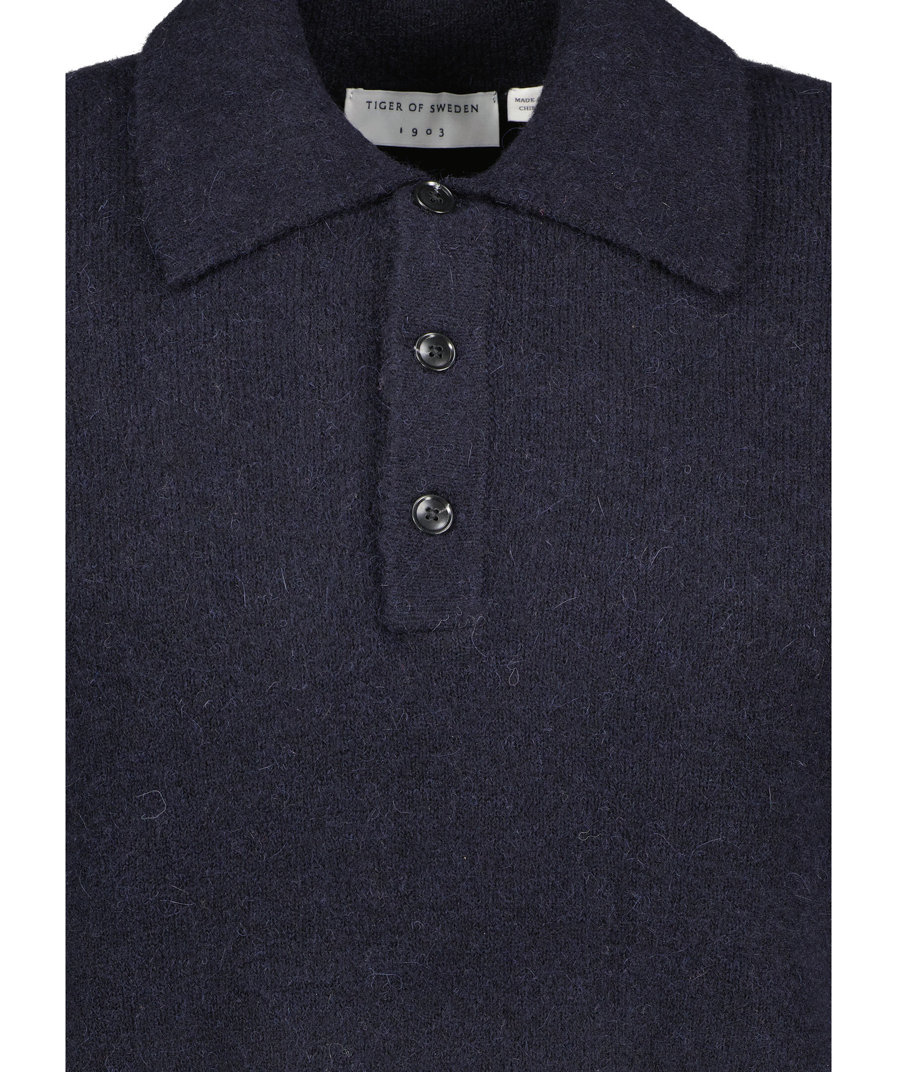 Mörkblå stickad pikétröja i långärmad modell från Tiger of Sweden. Tröjan har knäppning med knappslå i Milanosöm, ribbade detaljer i nederkant, ärm och halsringning. Tillverkad i en merinoblandning.