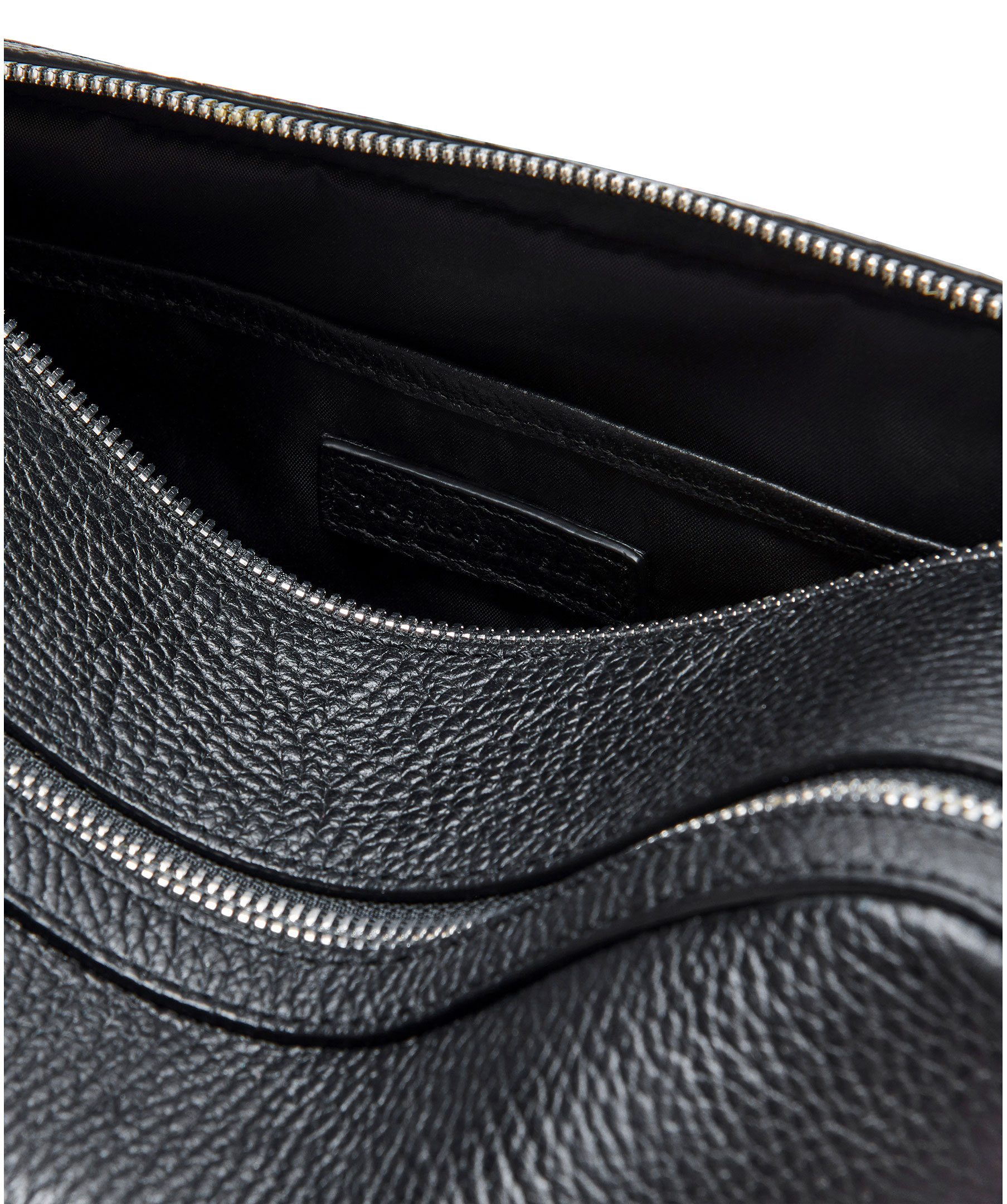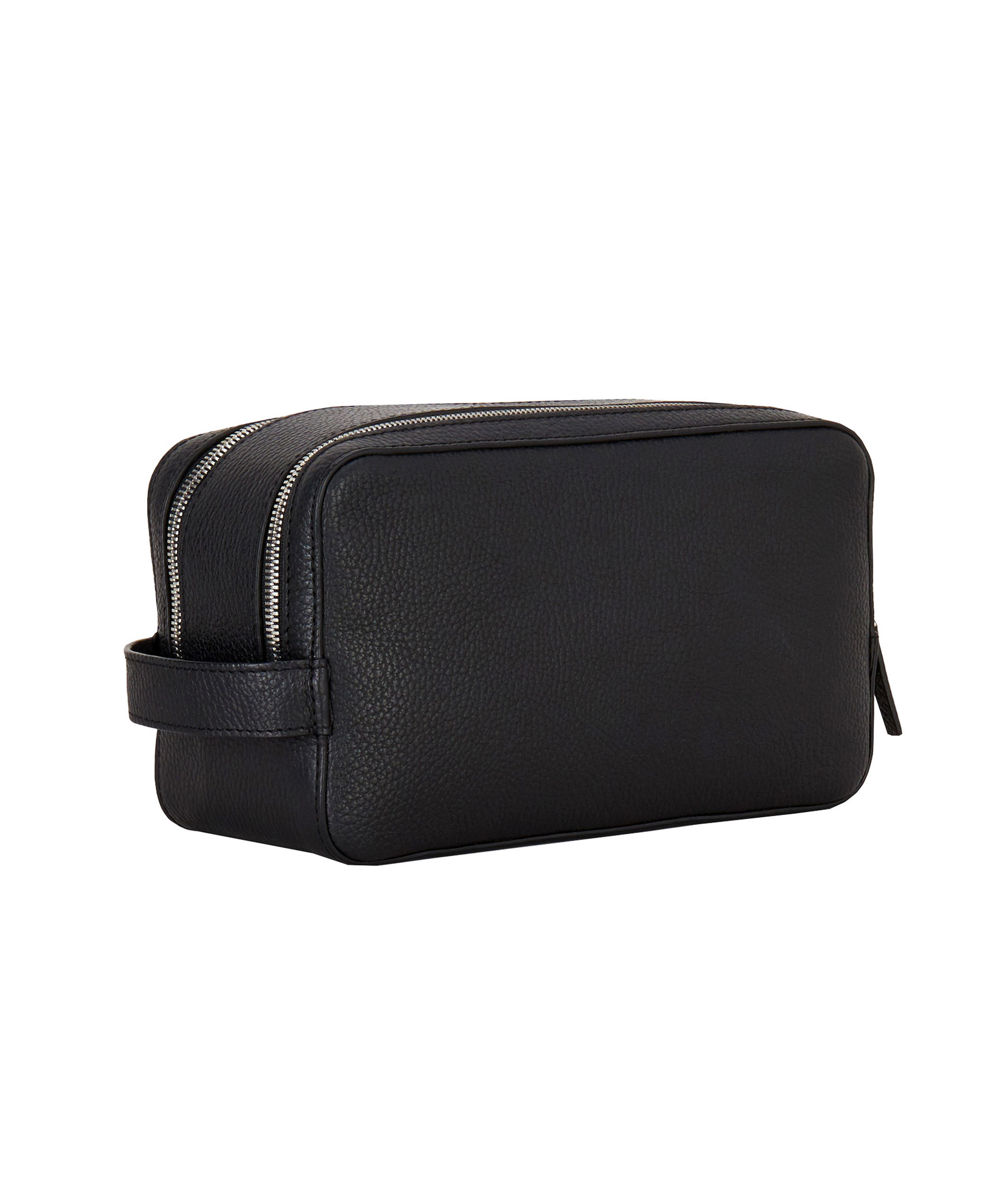Svart necessär i läder från Tiger of Sweden. Två fack med dragkedjor och mindre fack på insidan. Handtag på sidan och präglad logga på framsidan.