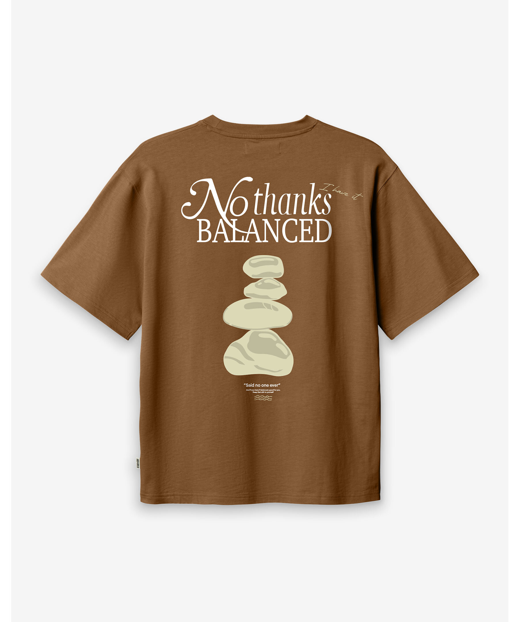 T-shirt från WOODBIRD gjord i 100% bomull. Tröjan har en liten logotyp på bröstet och ett större tryck på ryggen föreställande stenar som balanserar på varandra.