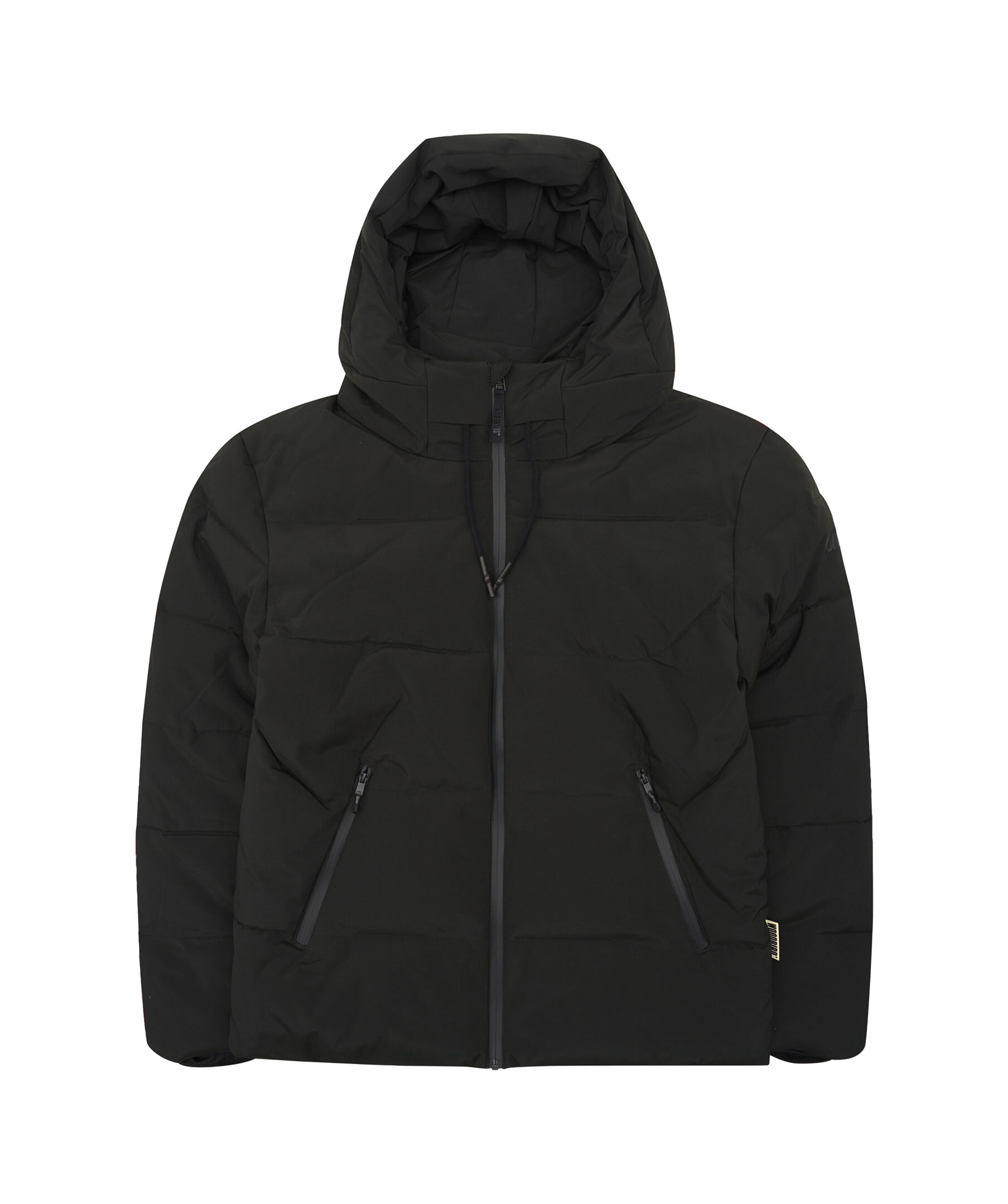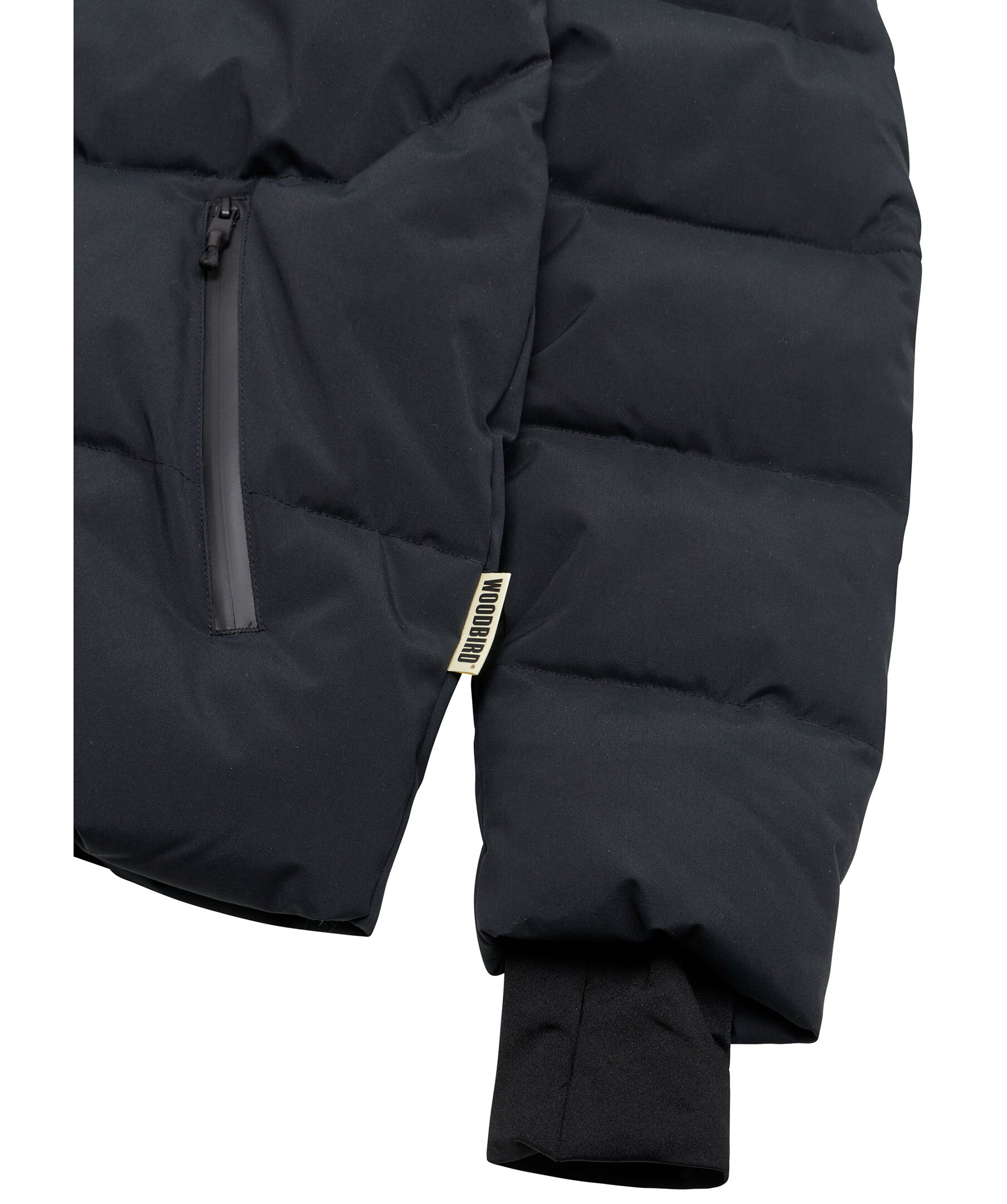 Svart pufferjacka från WOODBIRD. Jackan stängs med dragkedja och har huva med dragsko, två sidfickor med dragkedja samt skal med Breathex TPU-laminering. Den är både vind- och vattentät samt har bionic Eco-beläggning. Tillverkad i polyester.