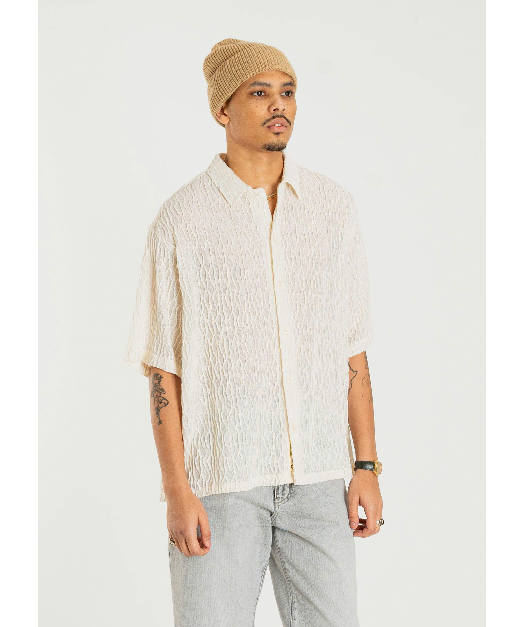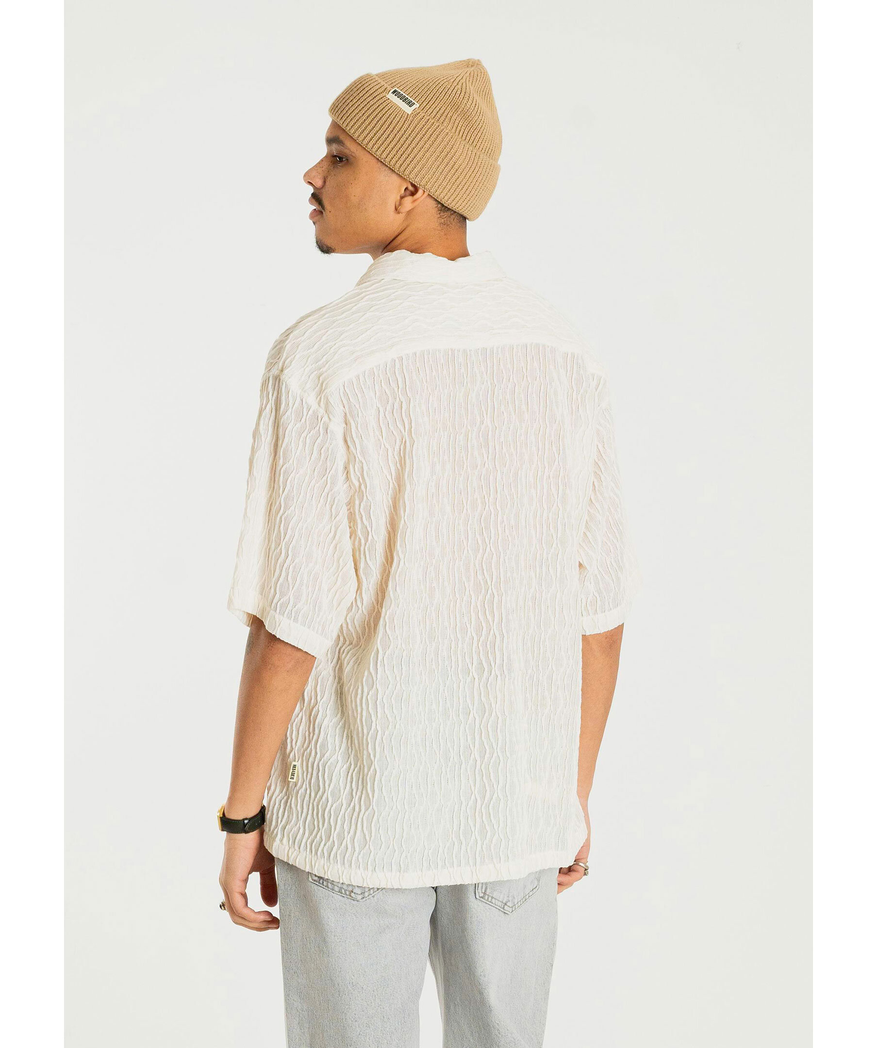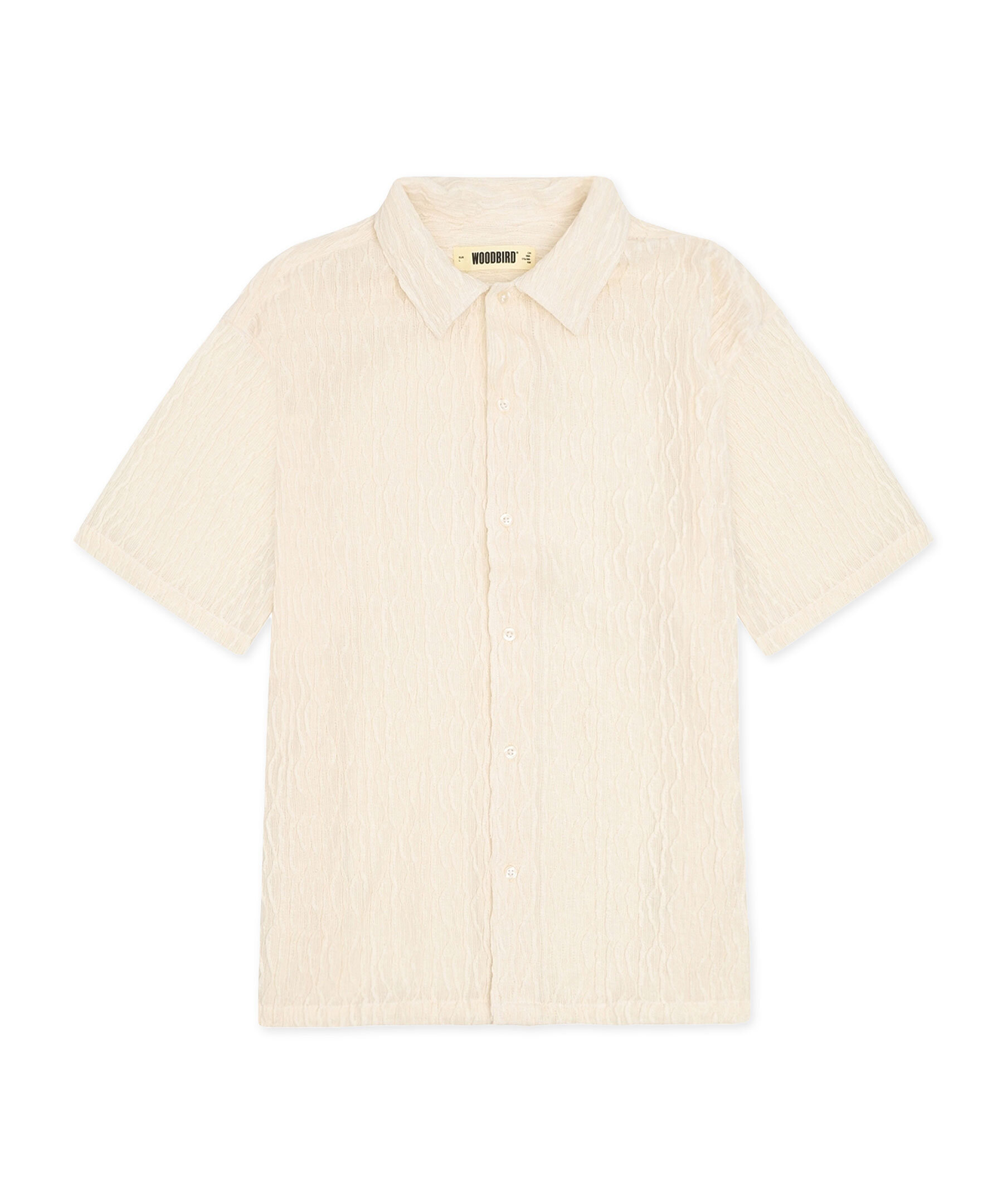 Off-white mönstrad skjorta från Woodbird. Skjortan har en klassisk krage och knappar framtill, korta ärmar och en vågig textur i tyget. Tillverkad av polyester.