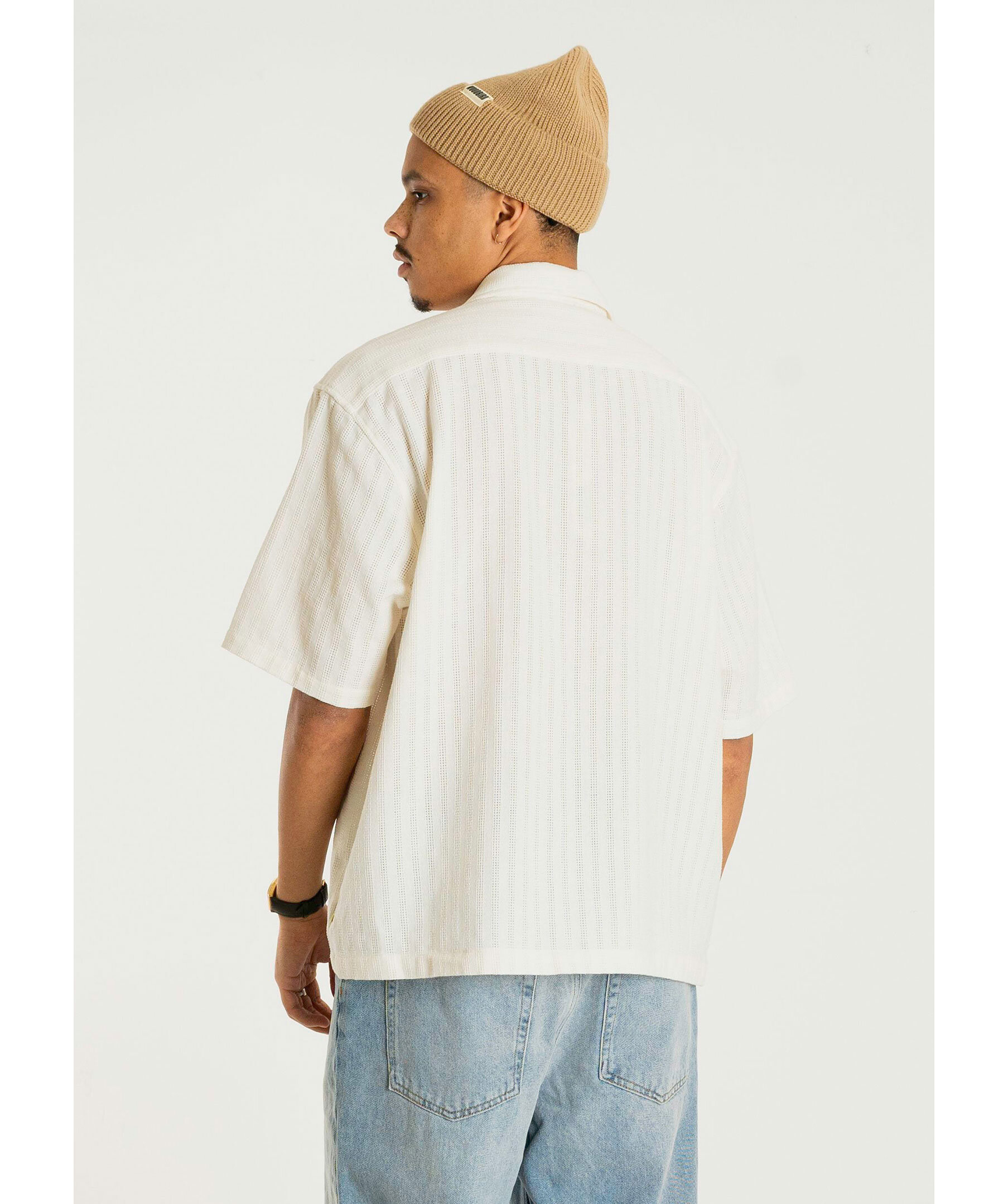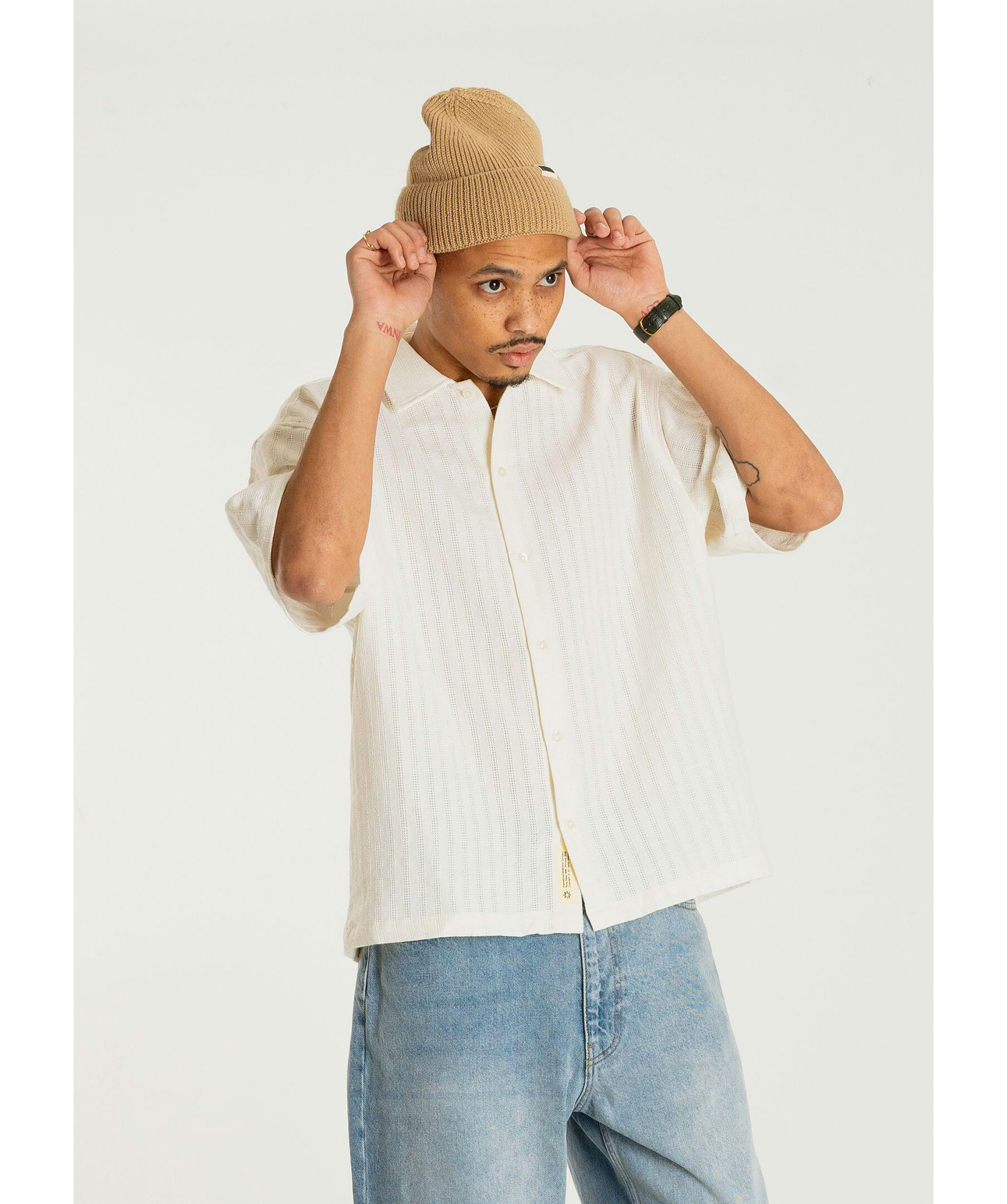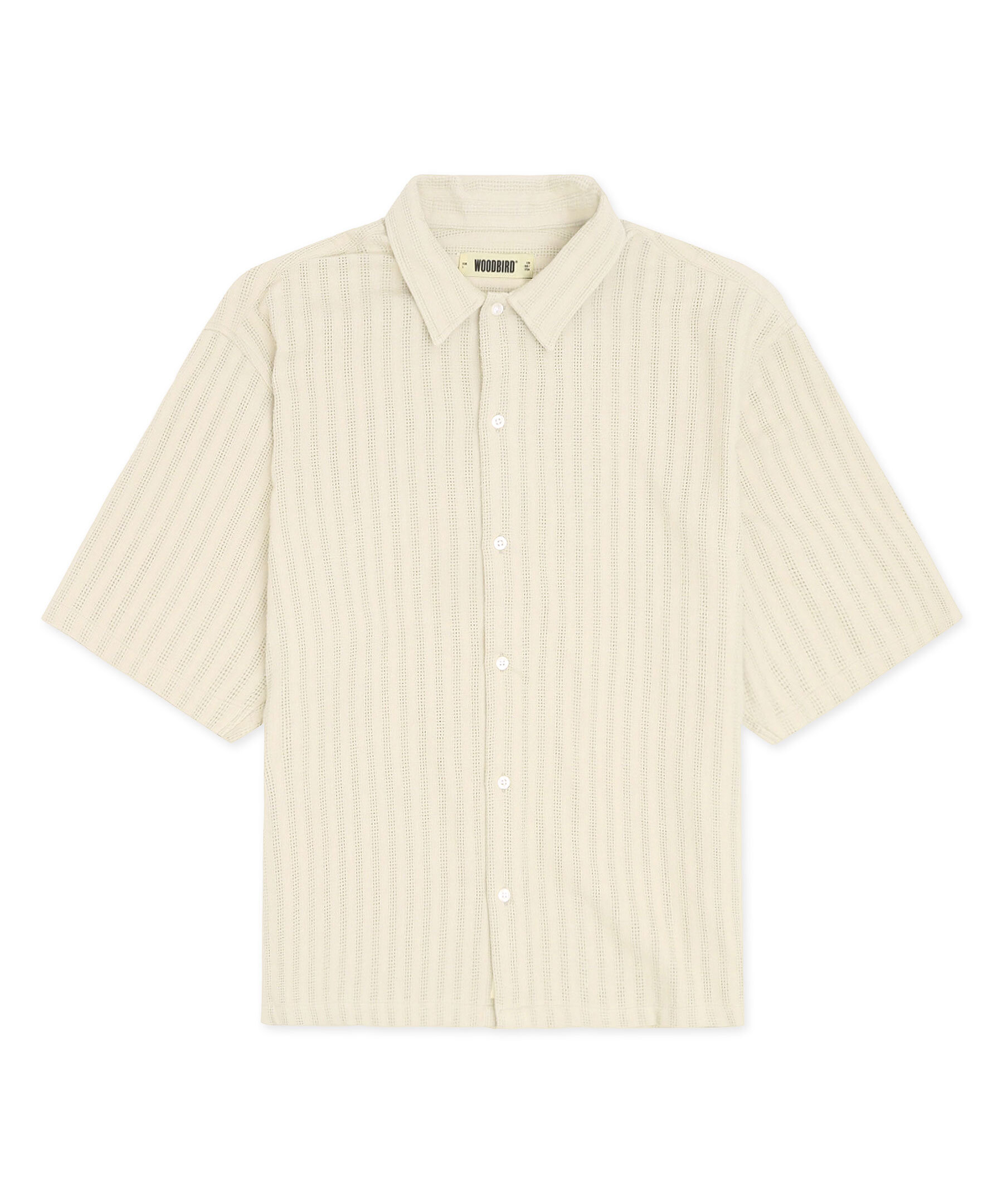 Vit mönstrad skjorta från Woodbird. Skjortan stängs med knappar fram, är kortärmad och har ett vertikalt, randigt mönster. Tillverkad av bomull.