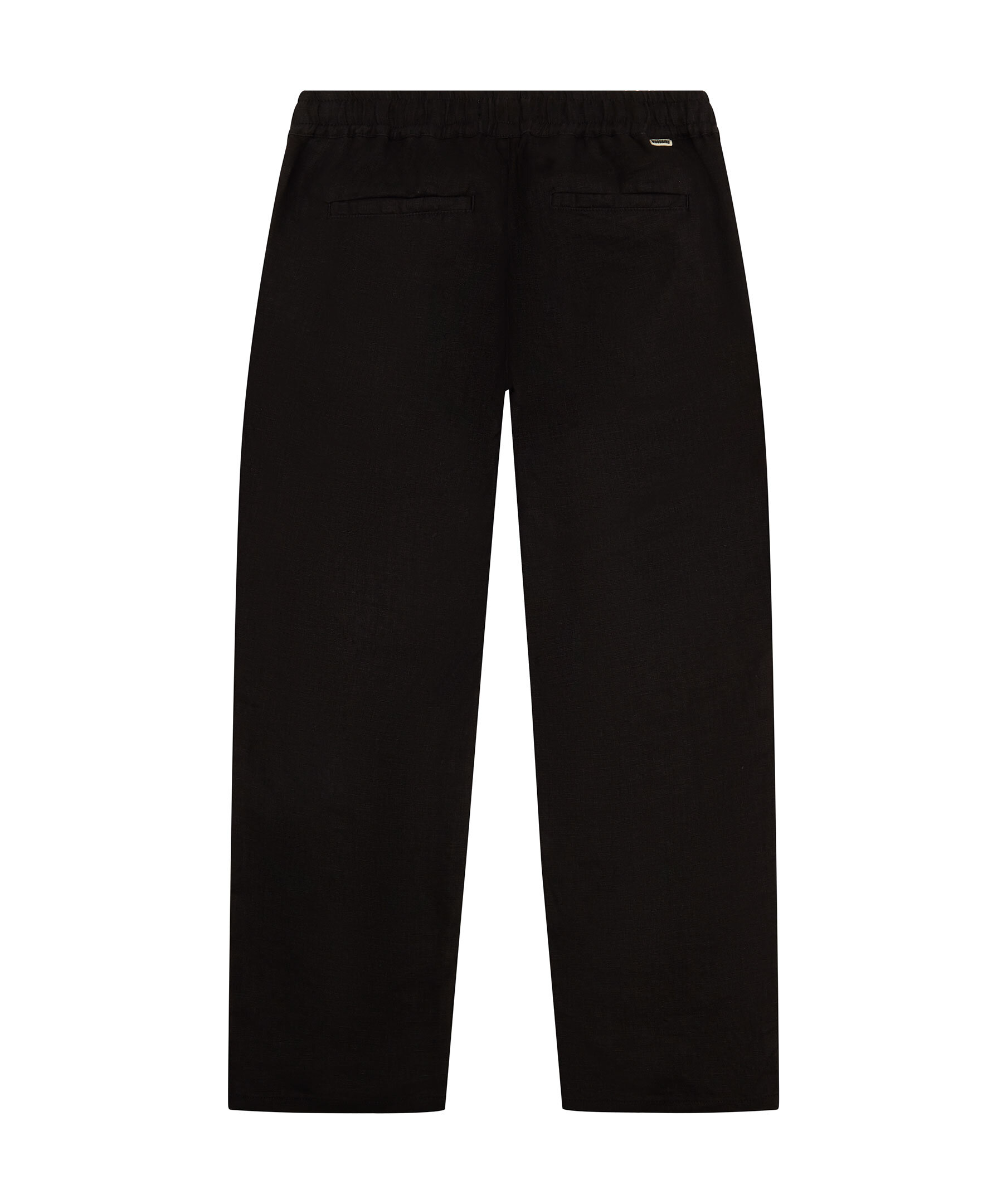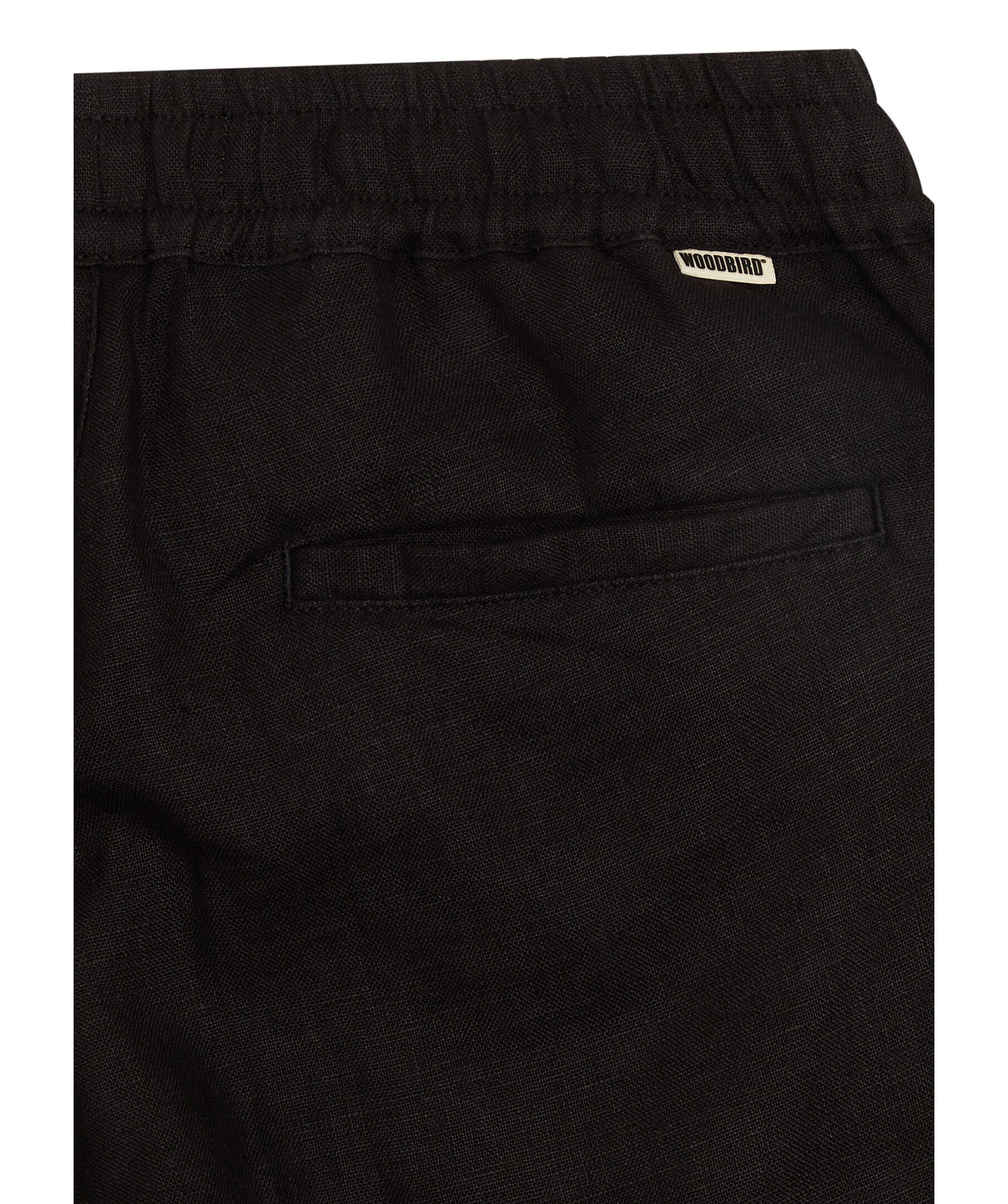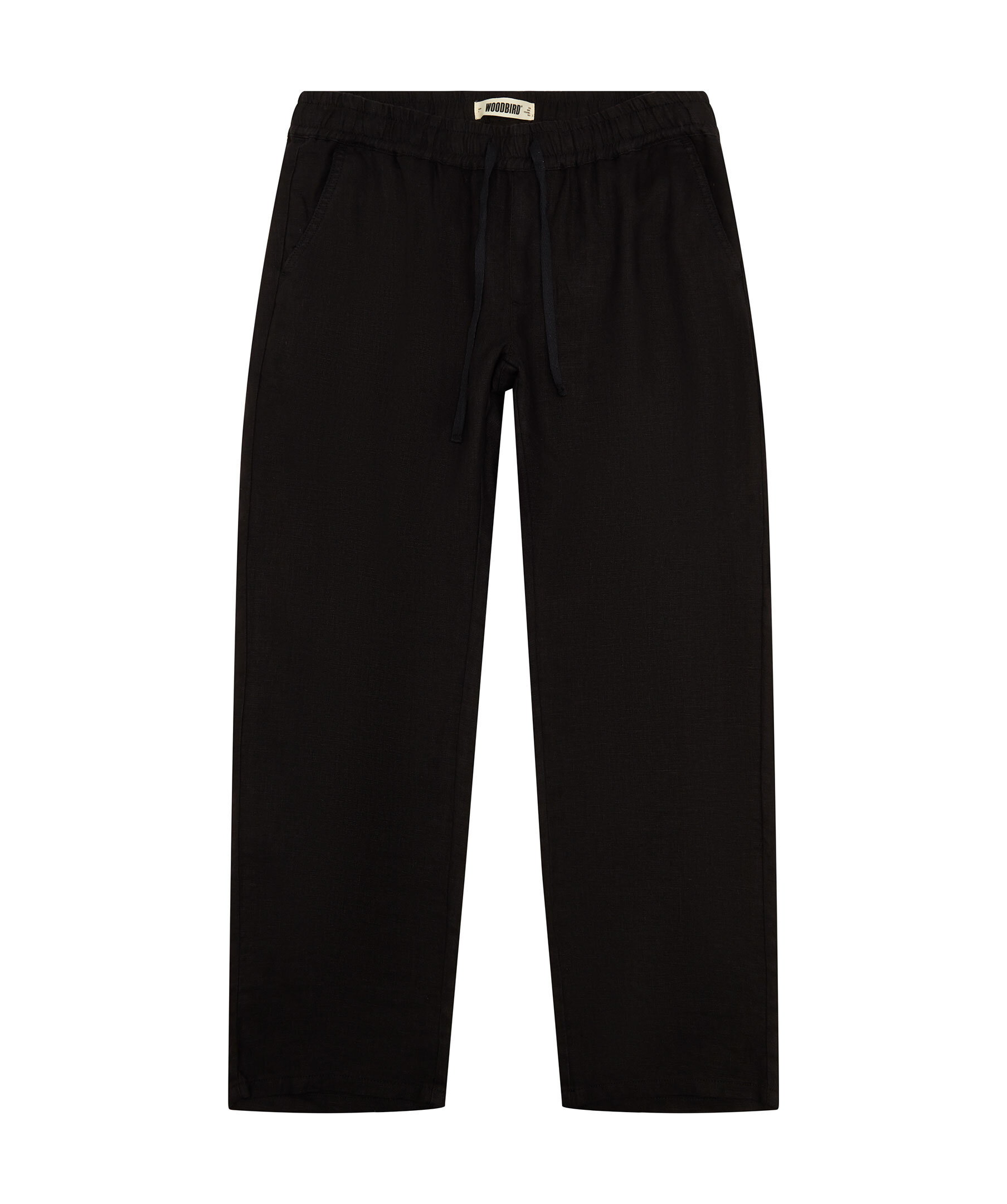 Svarta linnebyxor från Woodbird. Byxorna har elastisk midja med dragsko, två sidfickor samt två passpoalfickor baktill. Tillverkade i en linneblandning.