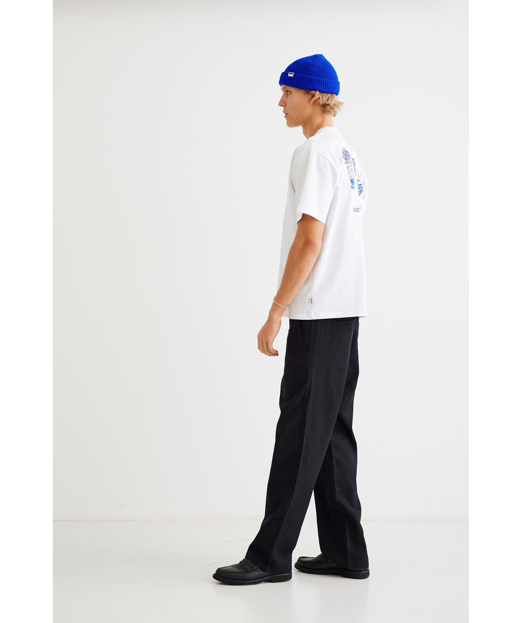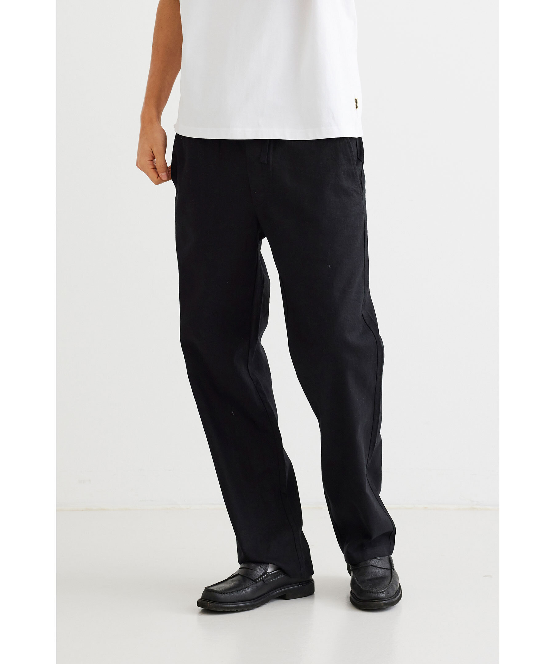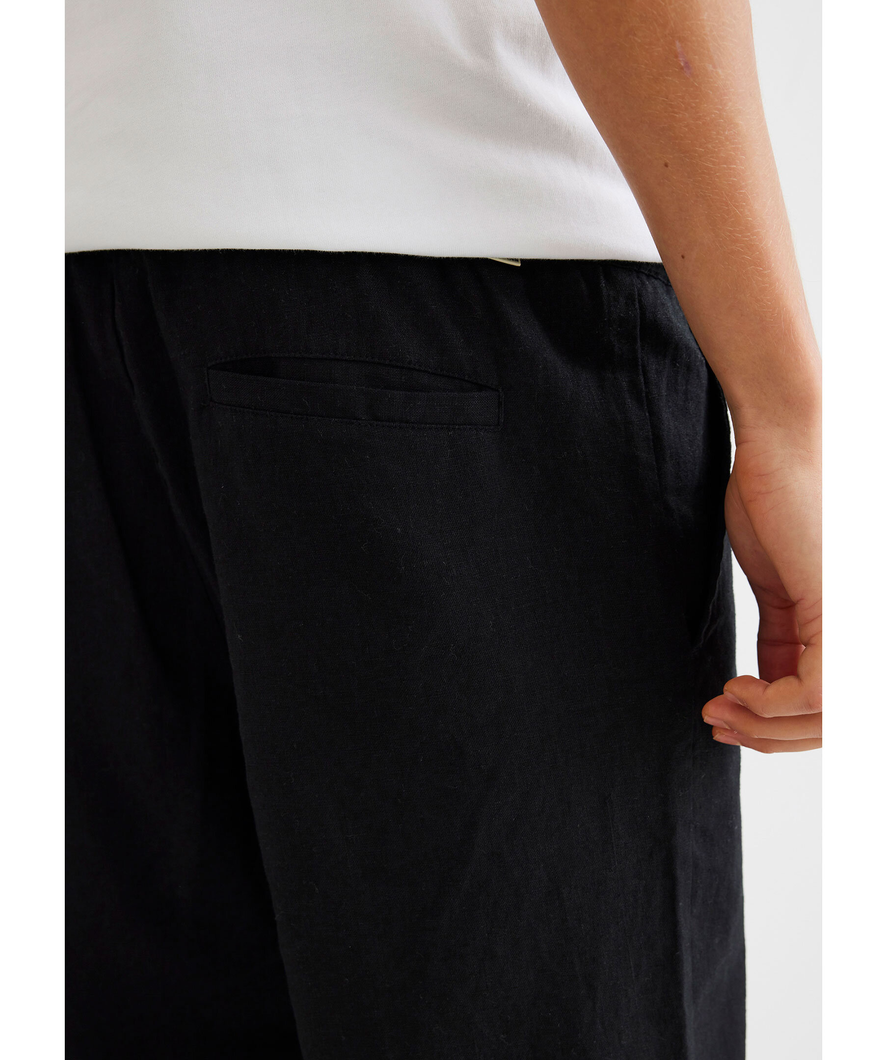 Svarta linnebyxor från Woodbird. Byxorna har elastisk midja med dragsko, två sidfickor samt två passpoalfickor baktill. Tillverkade i en linneblandning.