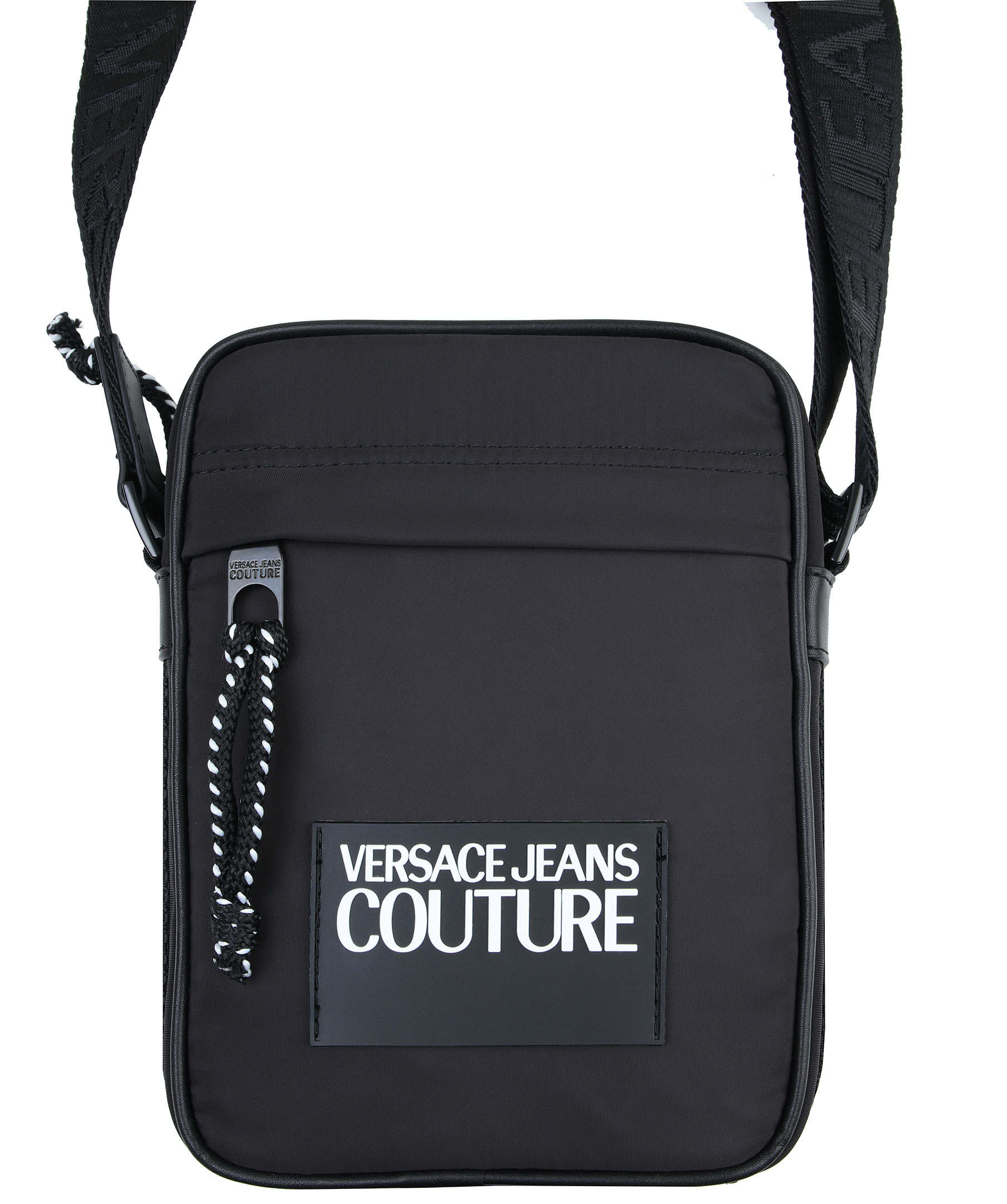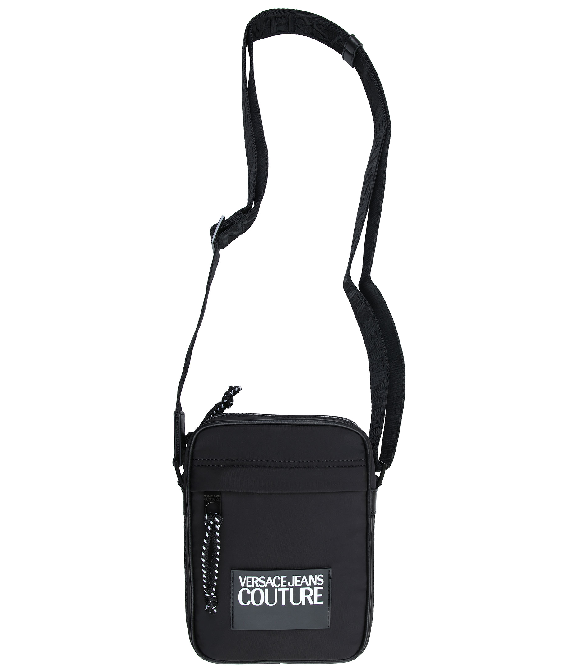 Svart liten messengerbag från Versace Jeans Couture. Tillverkad i textil. Vit text på sidorna, stor logotyp och ficka framtill, reflerbart axelband med diskret logga.
