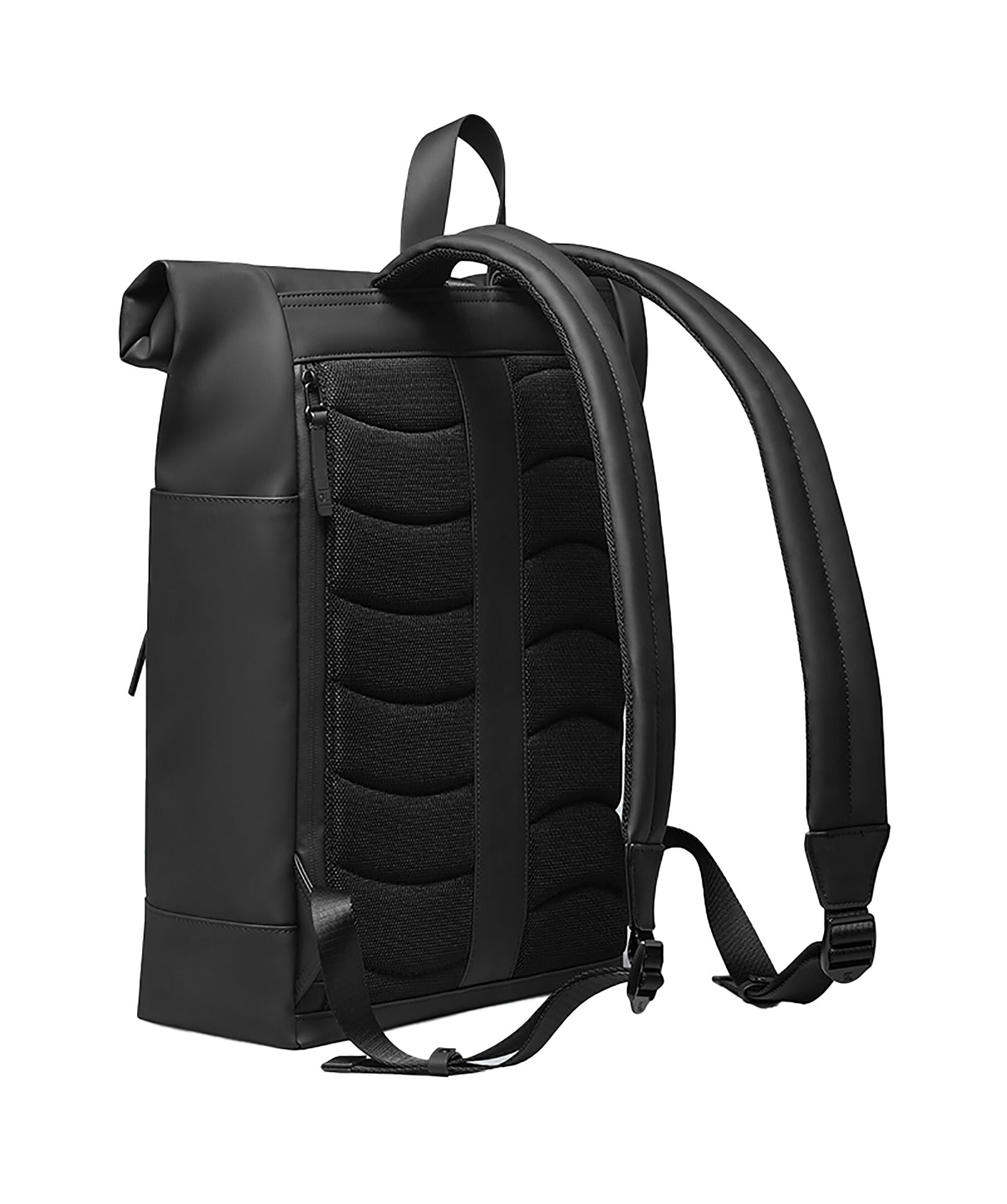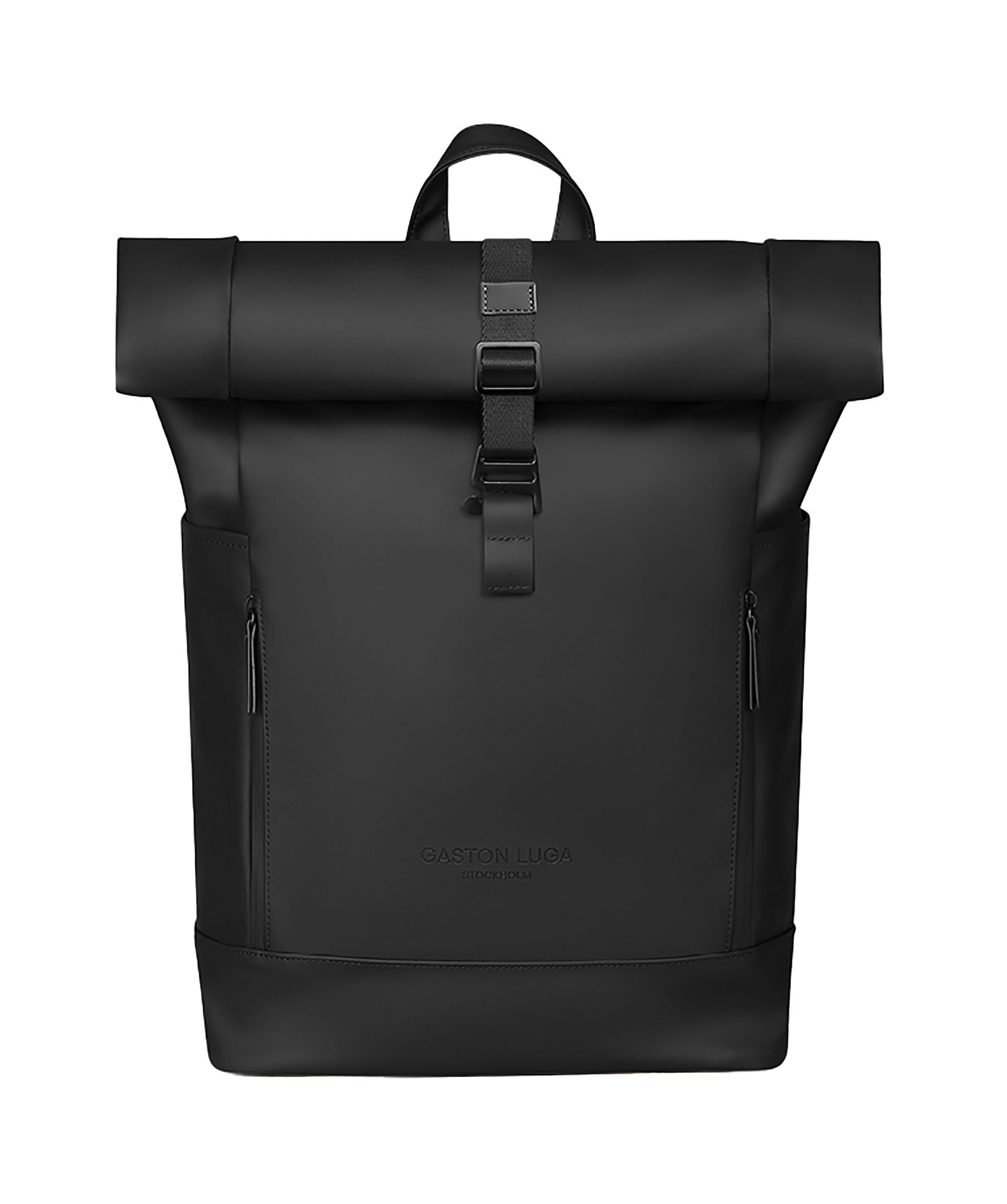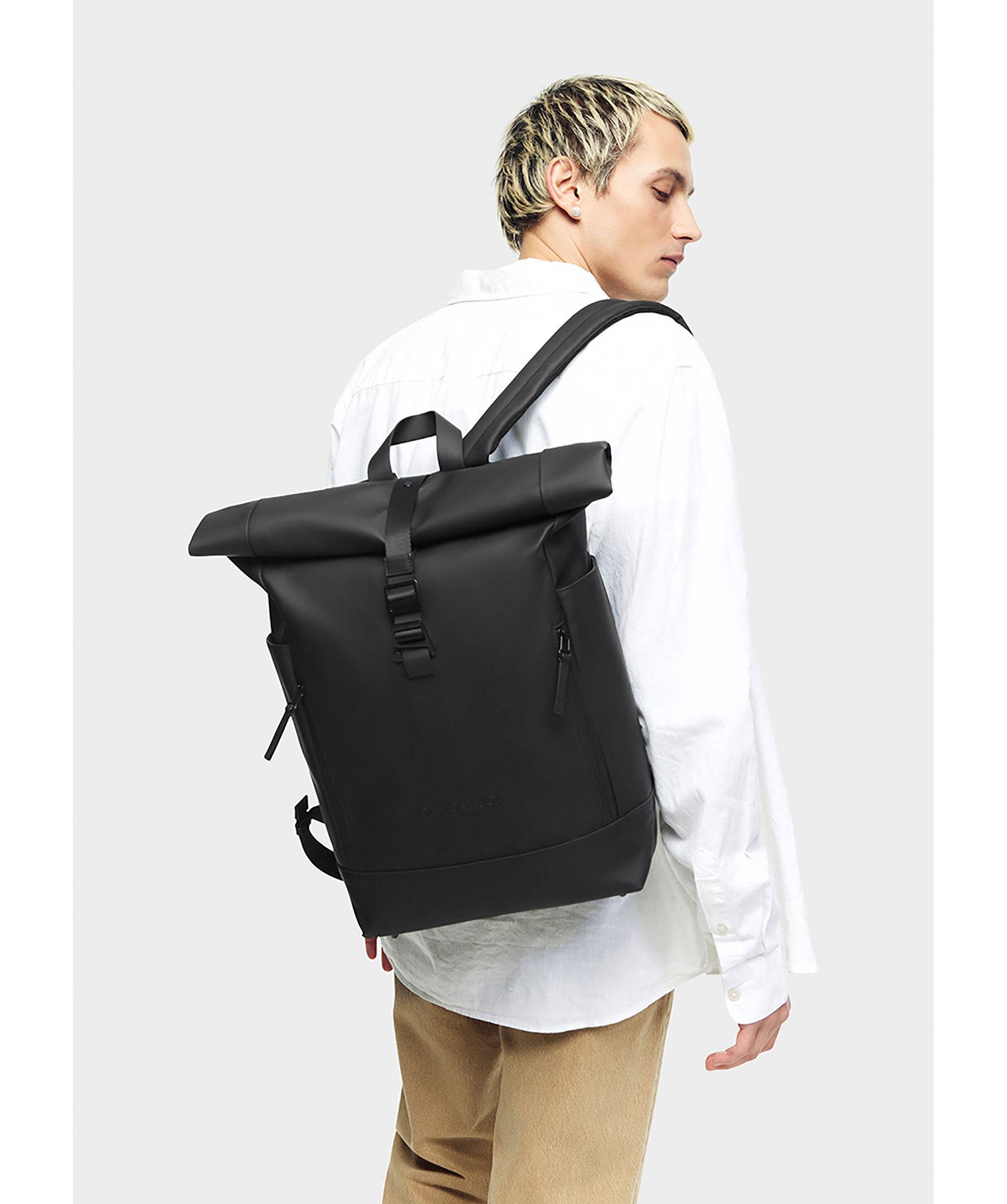 Svart ryggsäck från Gaston Luga. Rullen-ryggsäcken återvänder i ett mer planetvänligt material, mindre storlek och med två nya moderna färgblockerade mönster. Tillverkad av vattentät PU, den har deras signatur roll-top, så att du kan justera lagringsutrymme. Det stora huvudfacket rymmer lätt alla dina tillhörigheter, inklusive bärbara datorer upp till 13", och har gott om fickor för mindre väsentligheter. Mått: Utfälld: 57 x 27 x 13 / Ihoprullad till min. 46 x 27 x 13cm.