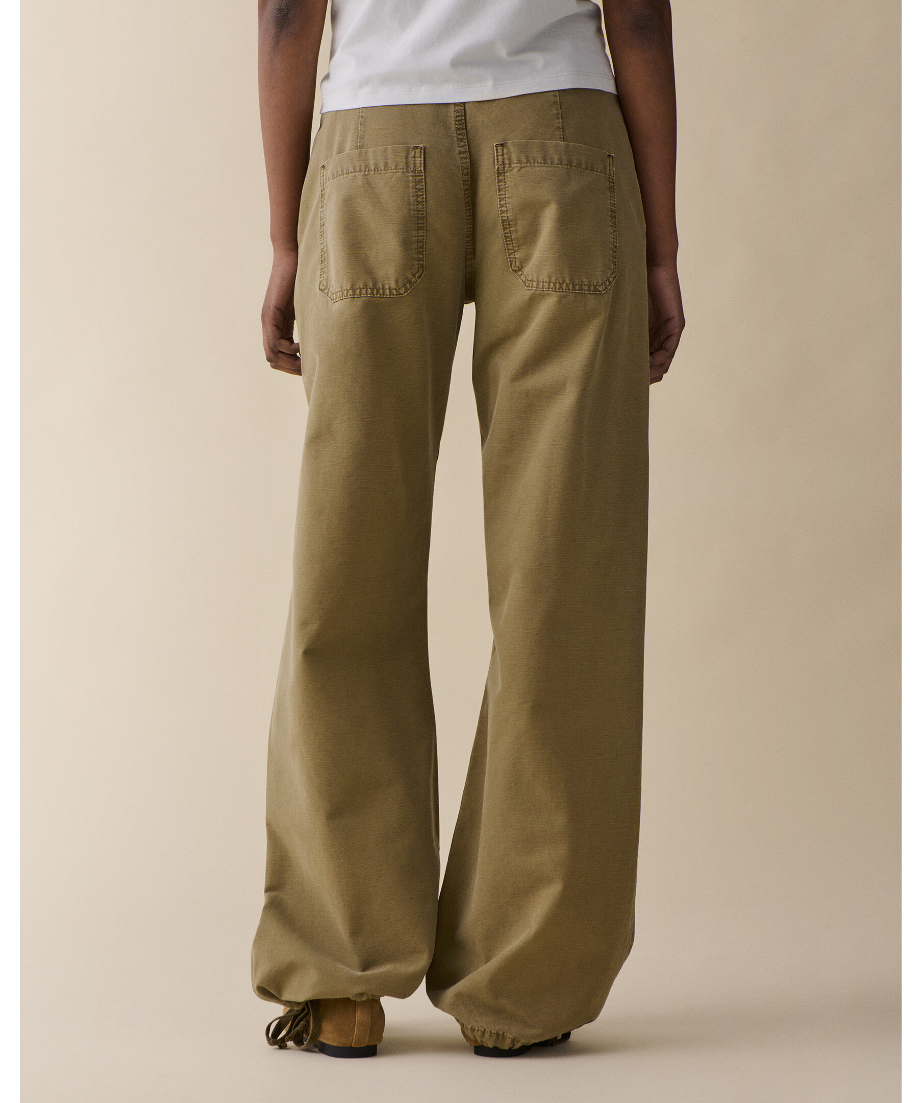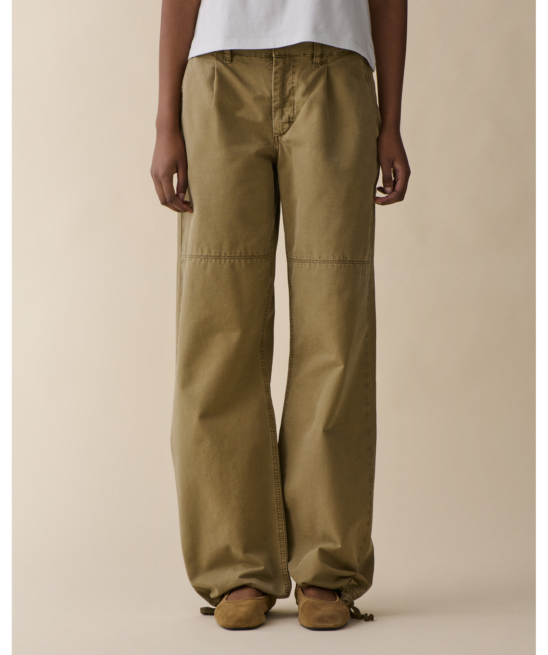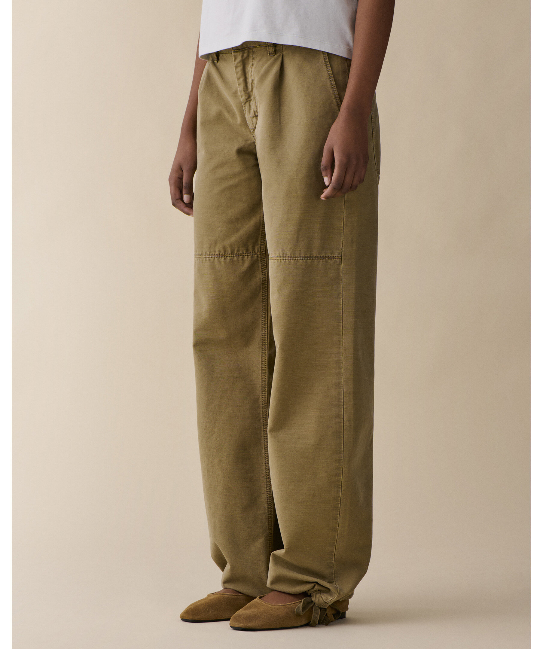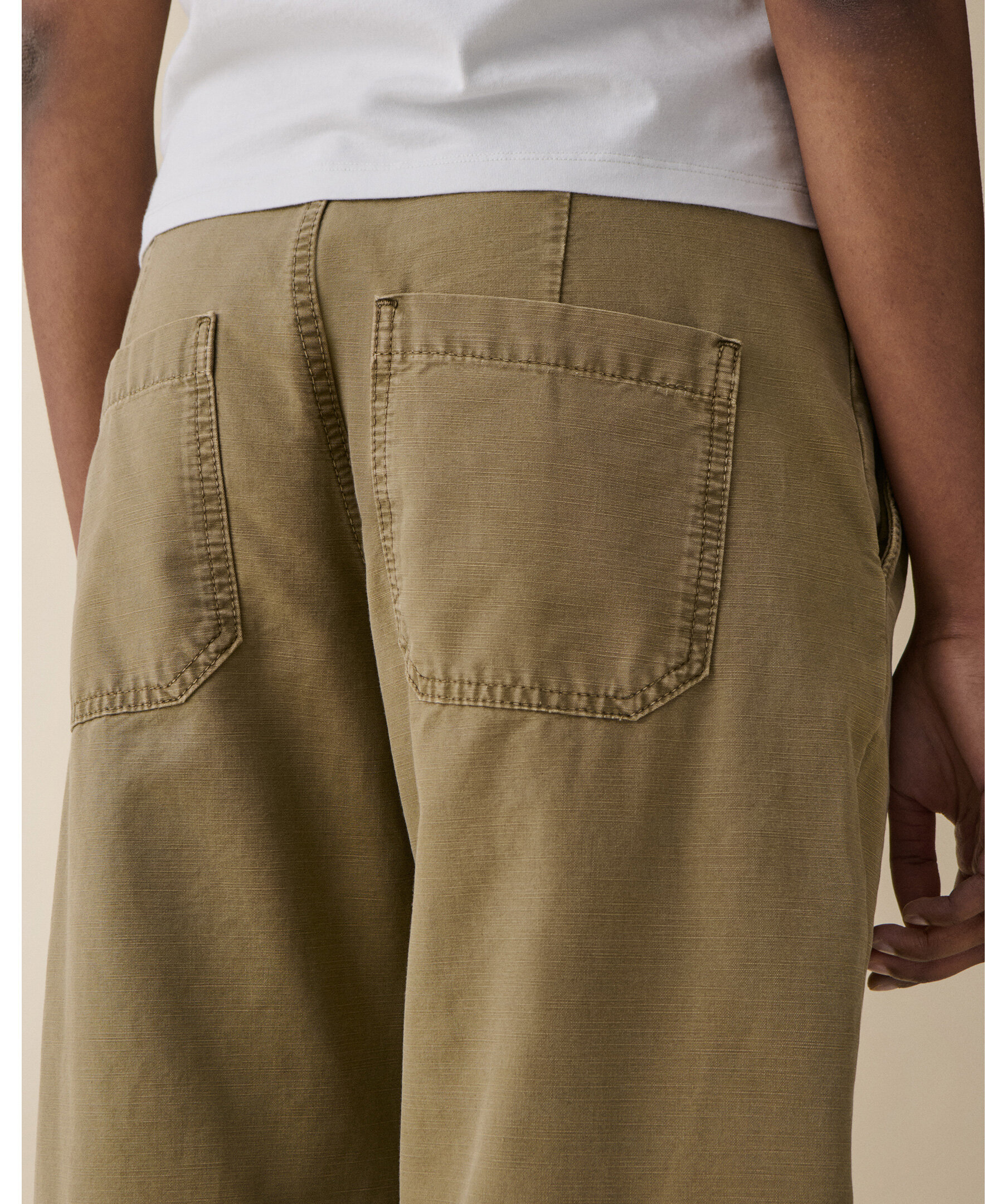 Lösa byxor från Jeanerica i khaki-beige bomull med low-rise midja, veck i midjan och dragkedja fram. Shortsens struktur och avslappnade silhuett ger en chic, casual look perfekt för säsongens outfits.