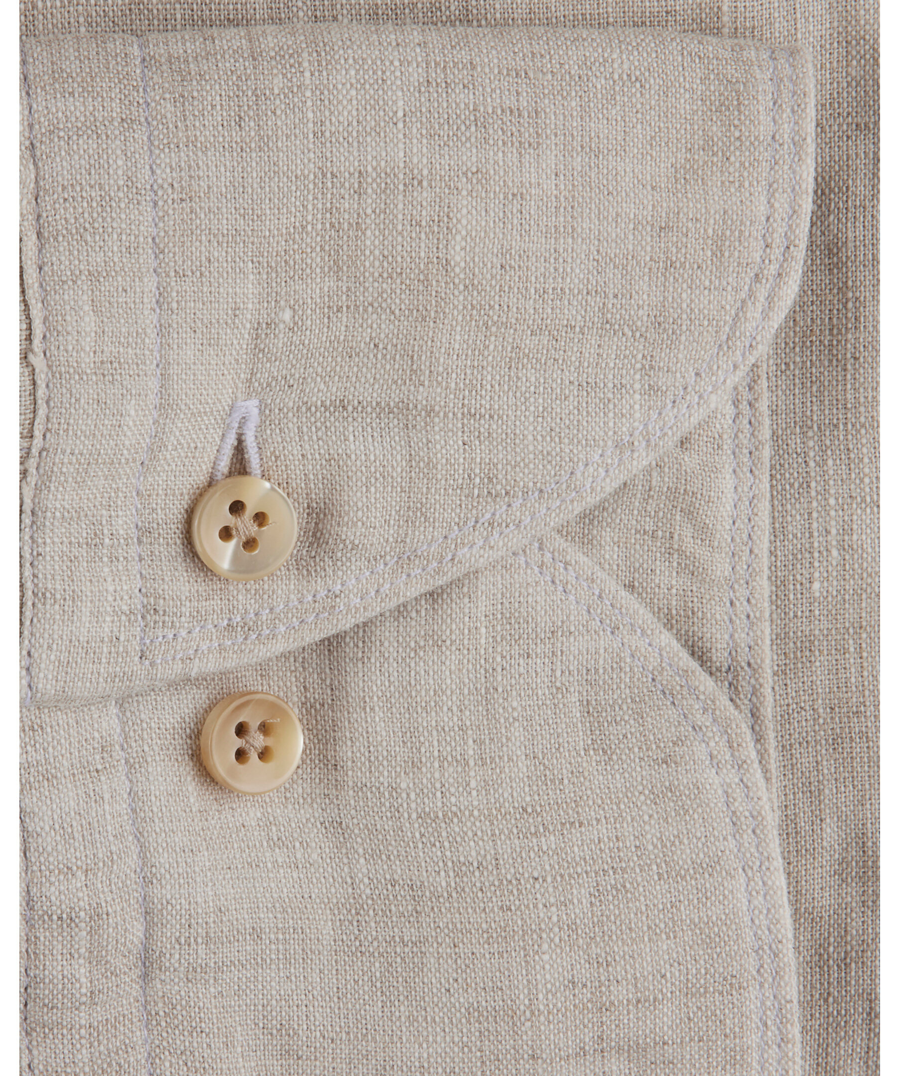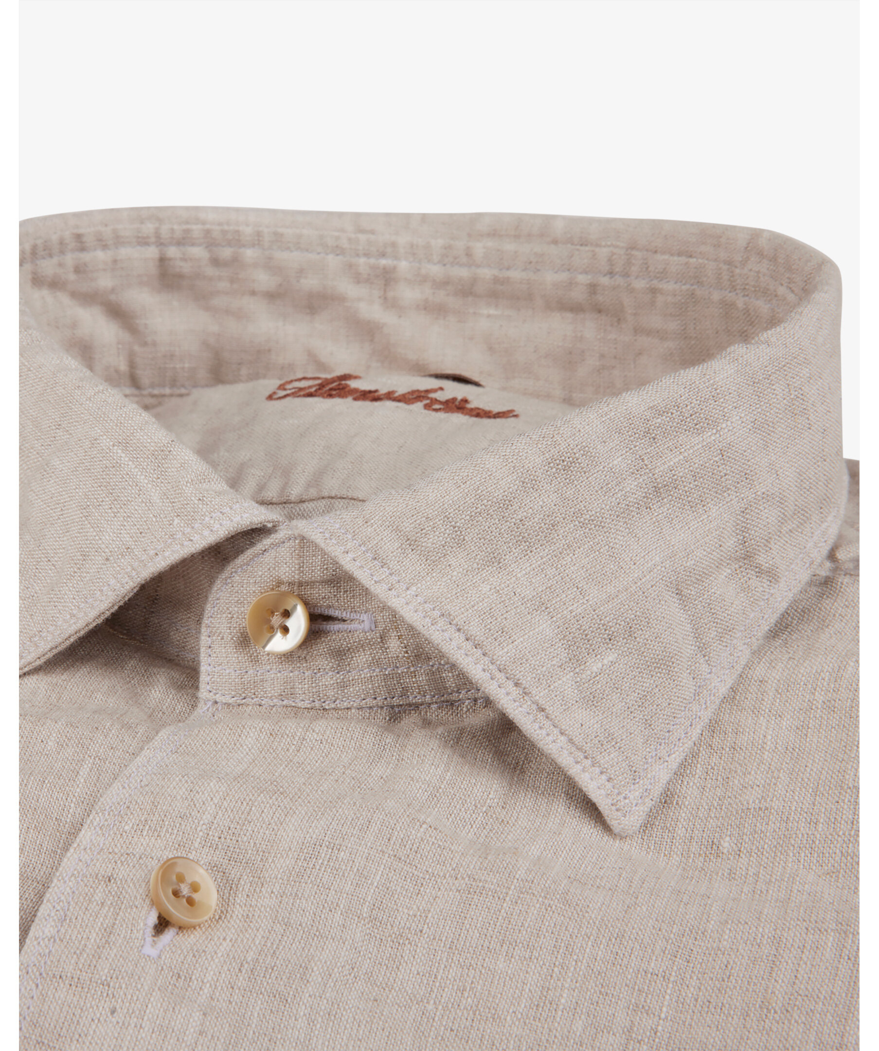 Beige casual skjorta är tillverkad av linne. Skjortan har pärlemorknappar, enkla manschetter och en cut away krage.